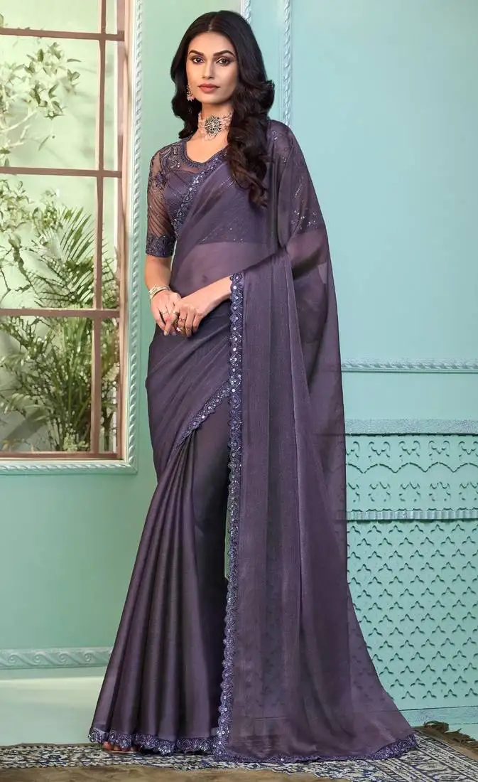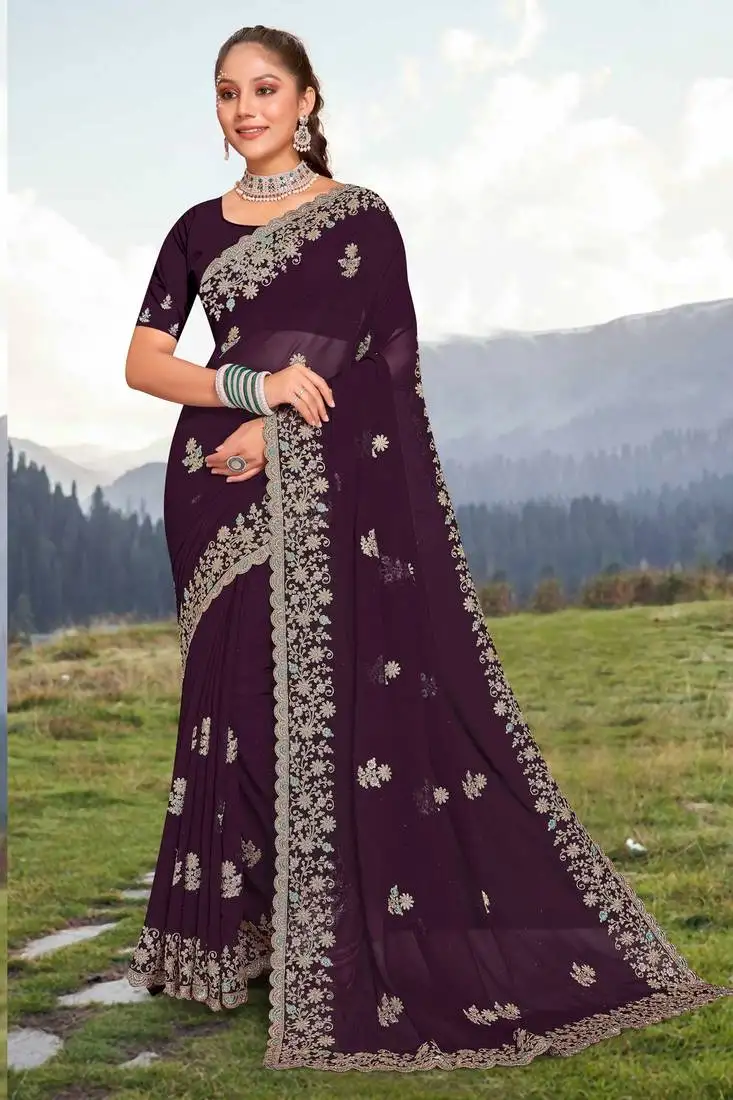• Women's purple georgette embellished saree with embroidered border comes with heavy work blouse piece