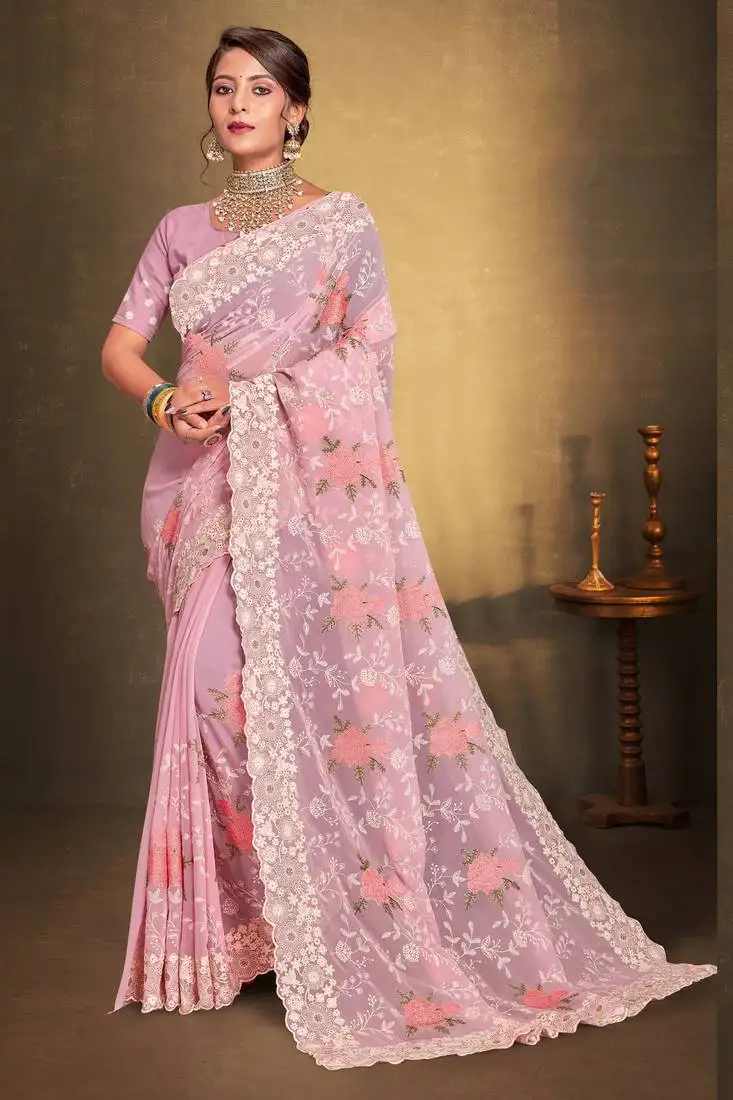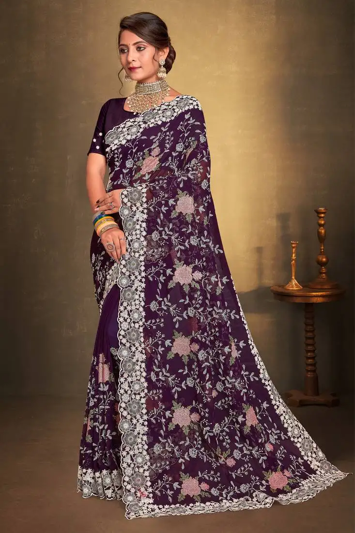 Women’s purple chikankari zari resham embroidered georgette saree with blouse piece by manu fashion era