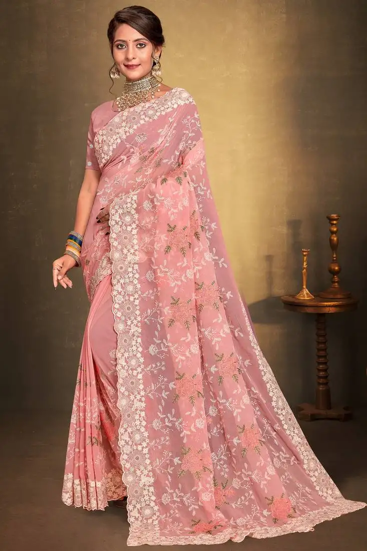 Women’s pink chikankari zari resham embroidered georgette saree with blouse piece by manu fashion era