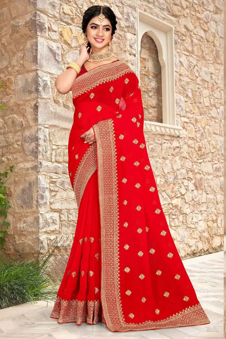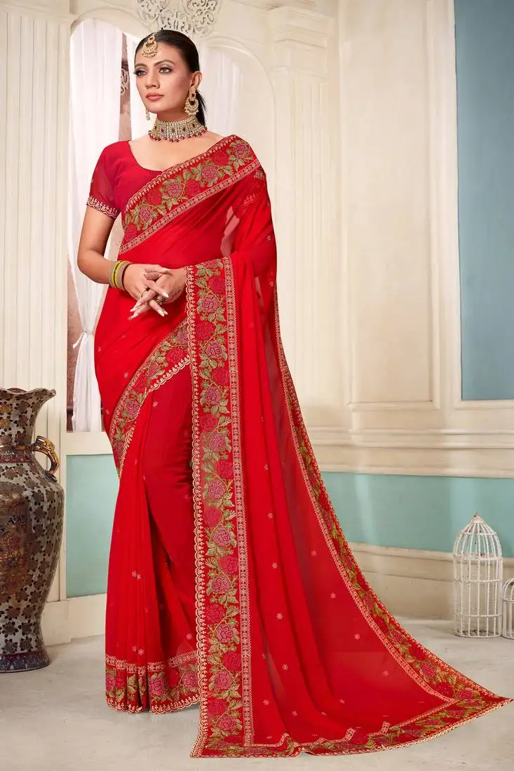 Women’s red zari resham embroidered georgette saree with blouse piece by manu fashion era