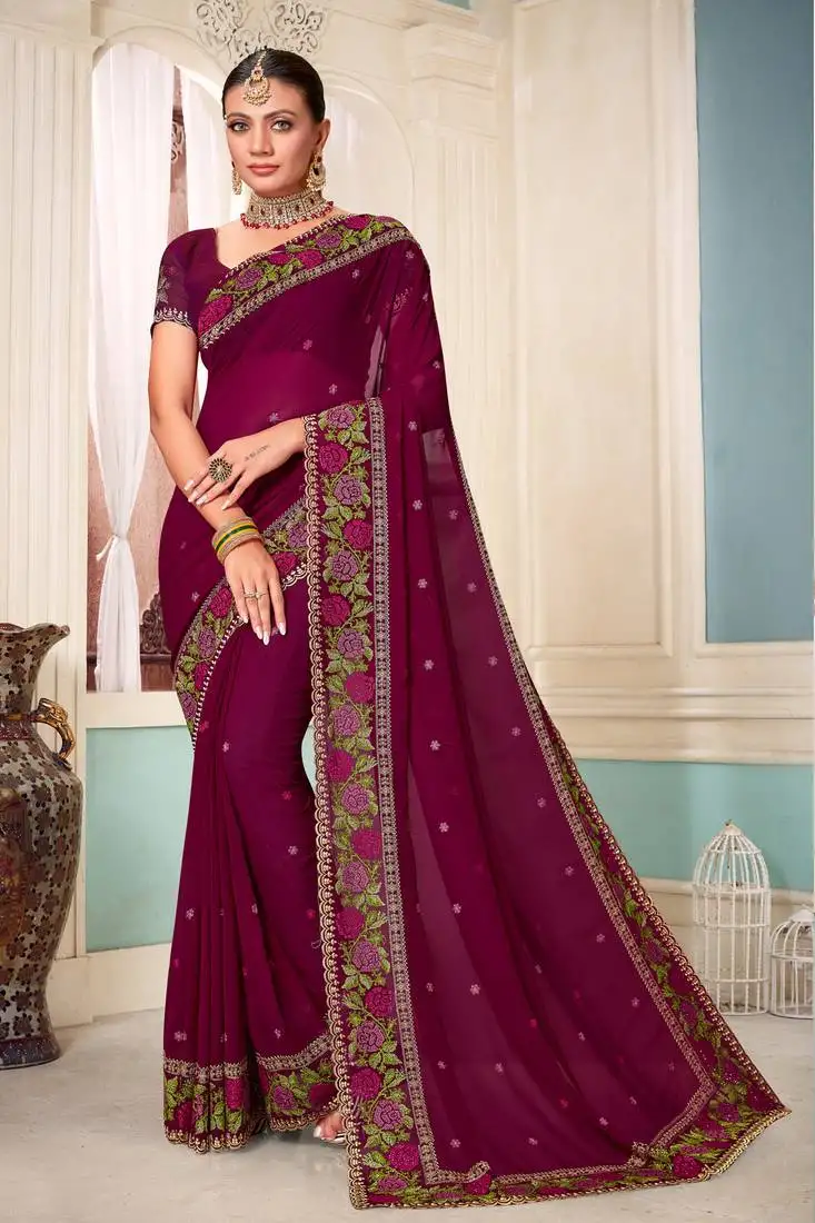 Women’s purple resham embroidered georgette saree with blouse piece by manu fashion era