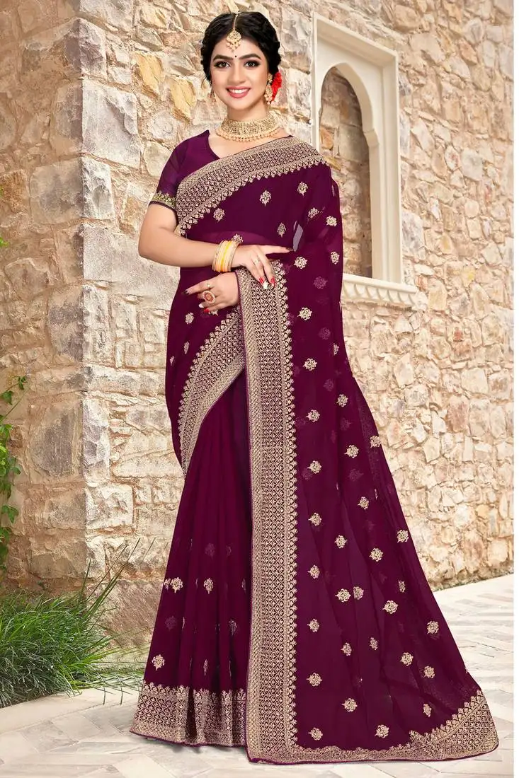 Women’s purple zari resham embroidered georgette saree with blouse piece by manu fashion era