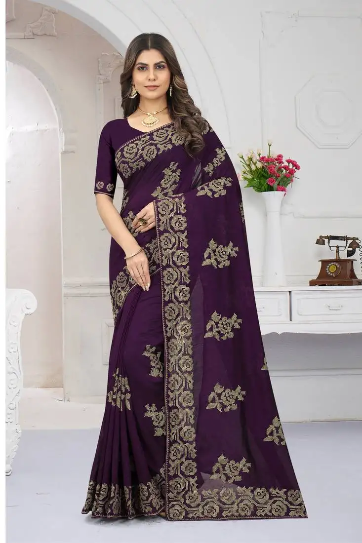 • Women's purple zari resham embroidered georgette saree with blouse piece by manu fashion era
