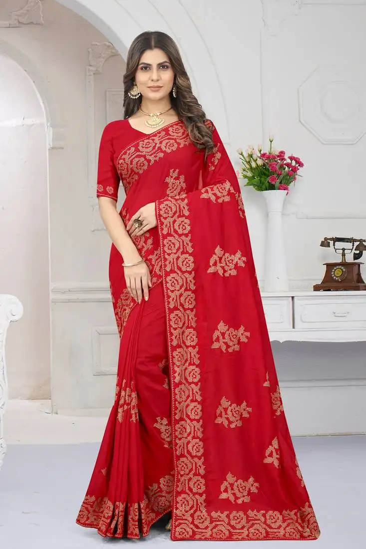 • Women's red zari resham embroidered vichitra silk party wear saree with blouse piece by manu fashion era