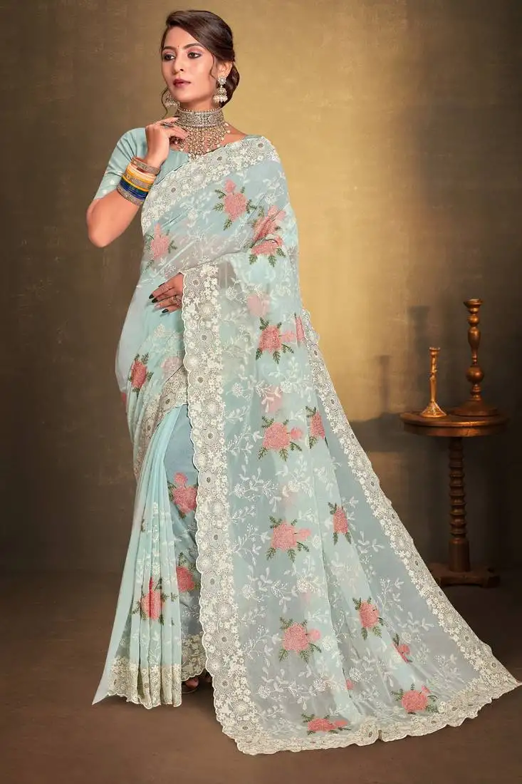 Women’s sky blue chikankari zari resham embroidered georgette saree with blouse piece by manu fashion era