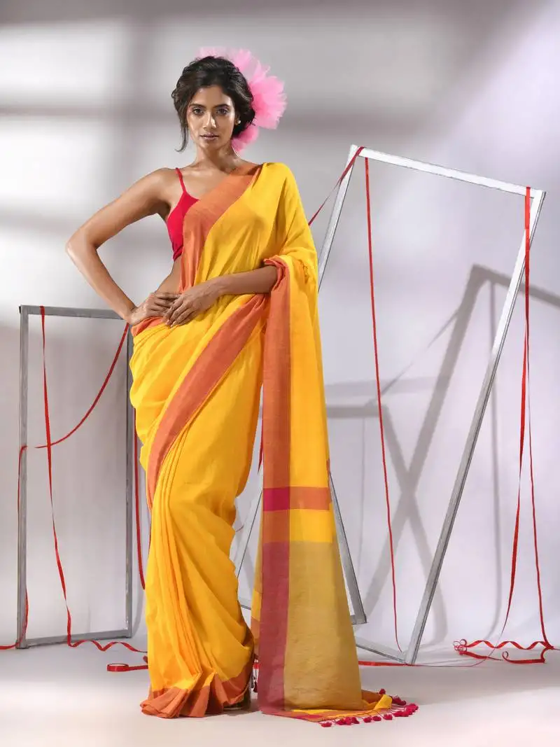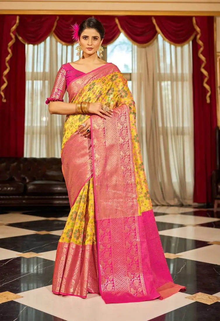 Sale!Yellow cotton blend banarasi patola style saree with blouse