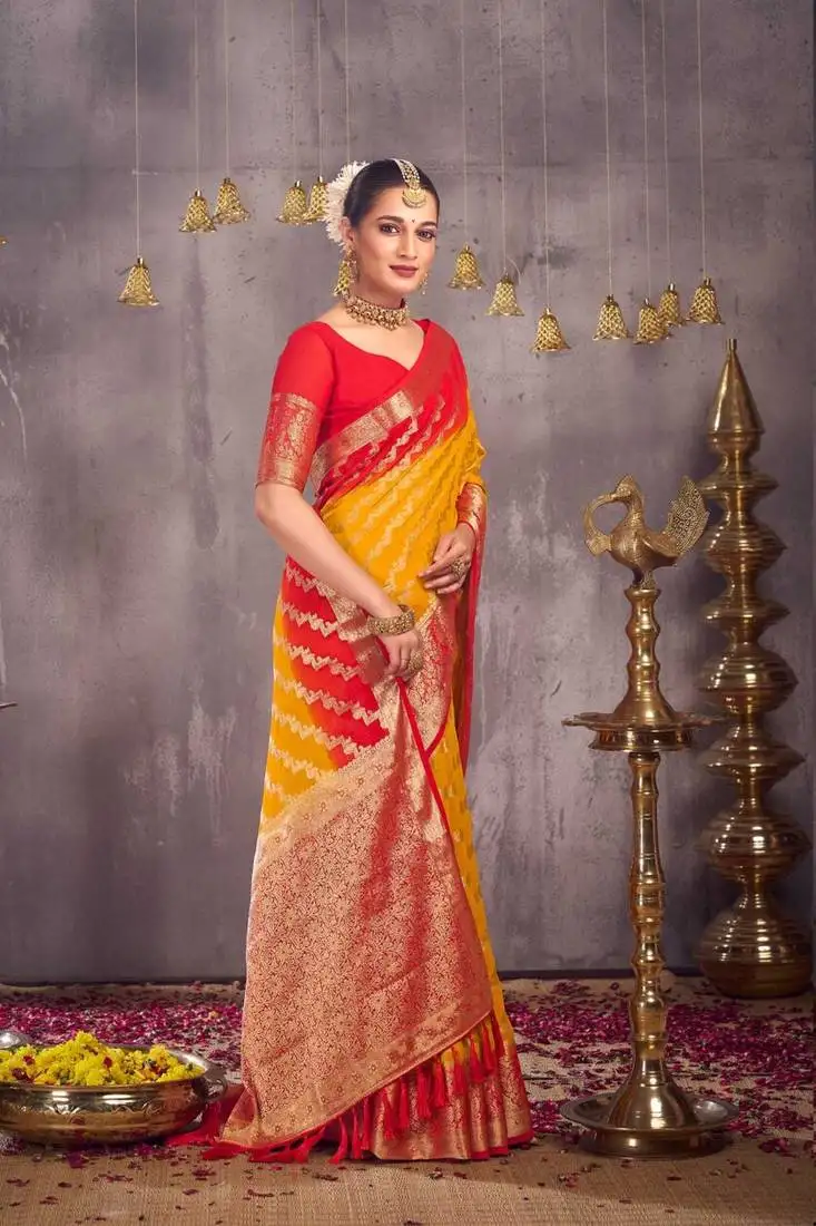• Yellow georgette solid:: tassels golden zari woven border saree with unstitched blouse piece