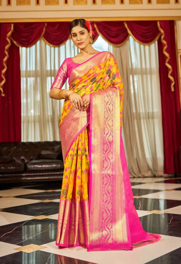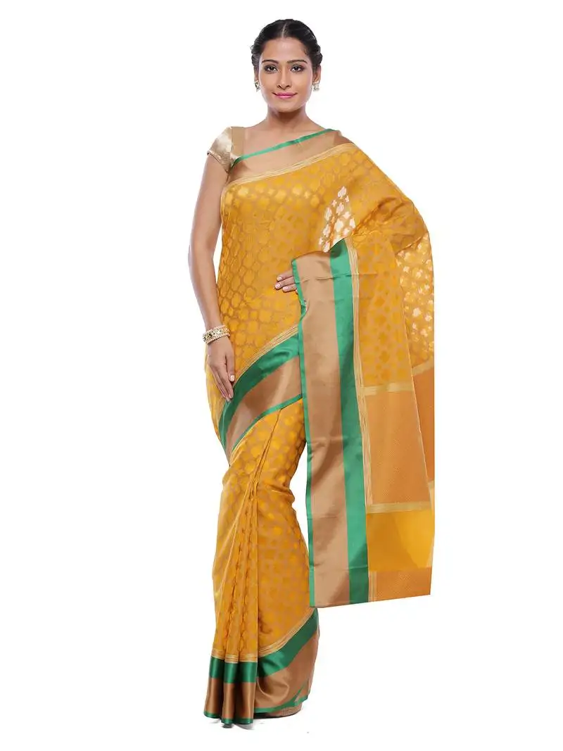 • Yellow geomatric organza silk bland zari border saree with blouse