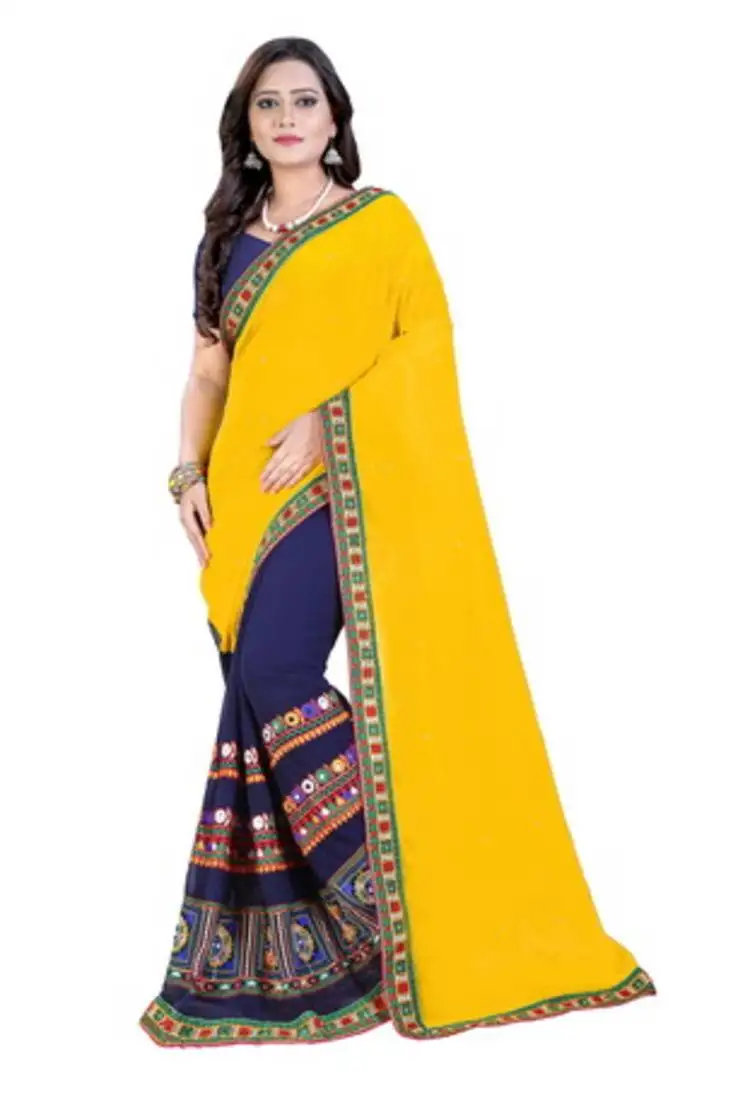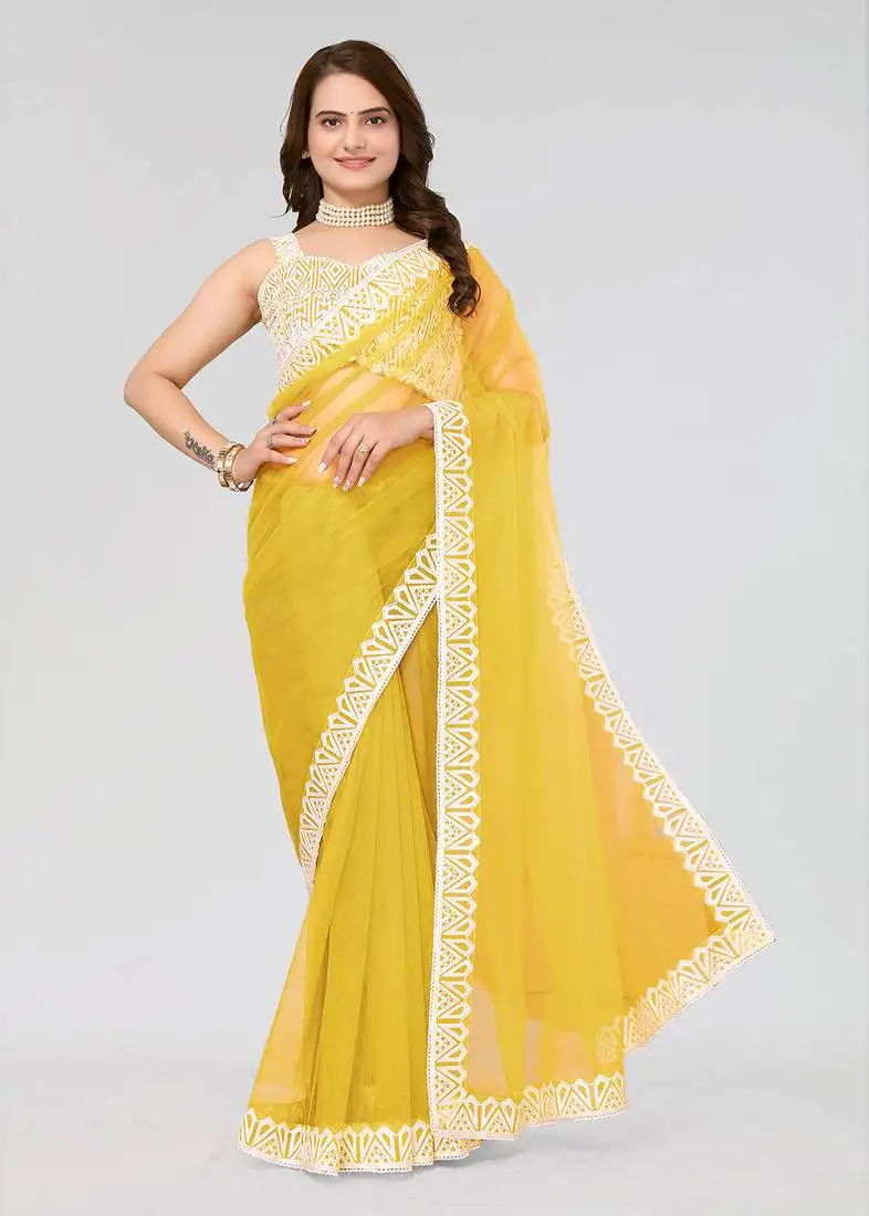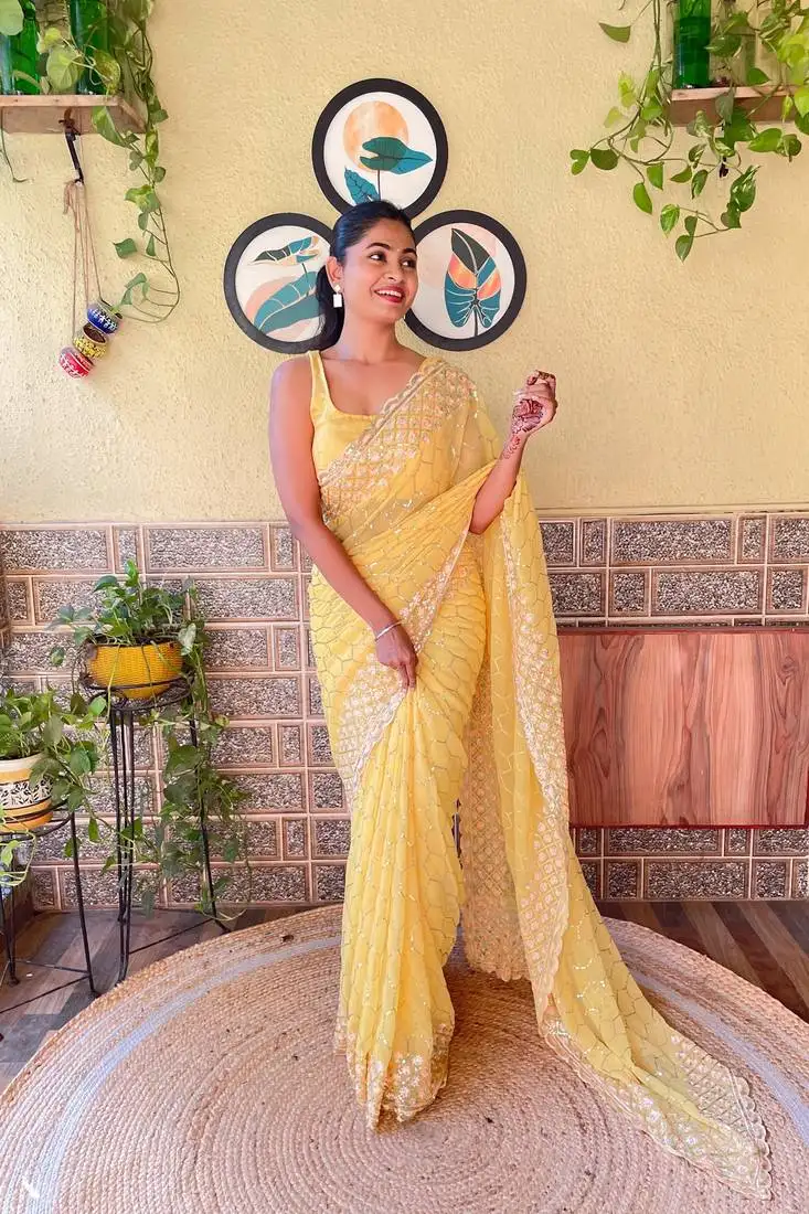 Yellow girlish partywear designer sequins embroidery work trendy saree