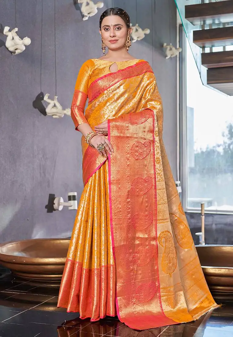 Yellow faux kanchipuram silk jaal traditional rich zari woven saree