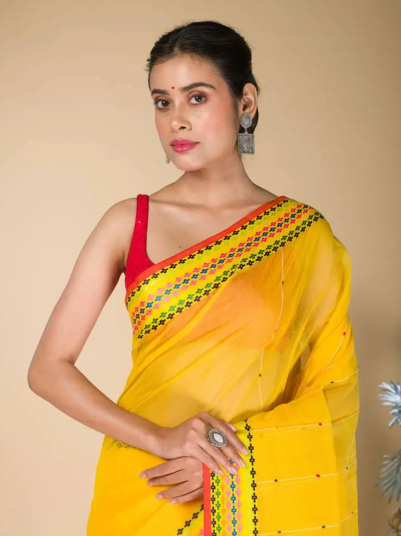Sale!Yellow polka paithani silk contrast zari woven saree with unstitched blouse