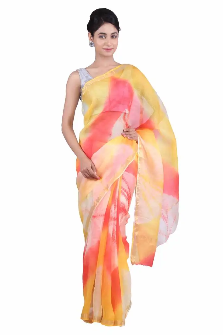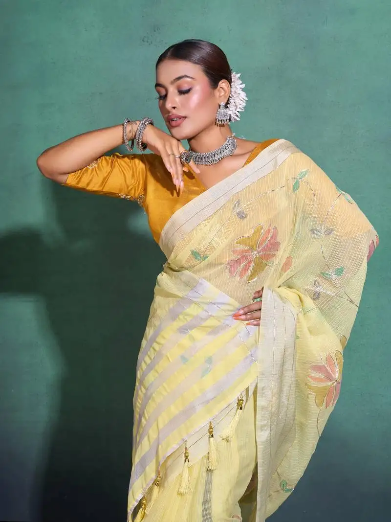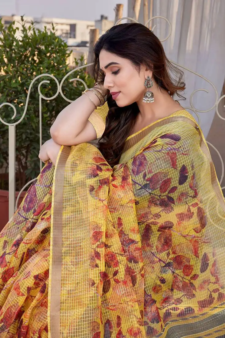 Sale!Yellow kota doria::Polyester leaf print::Floral print golden zari border saree with unstitched blouse piece