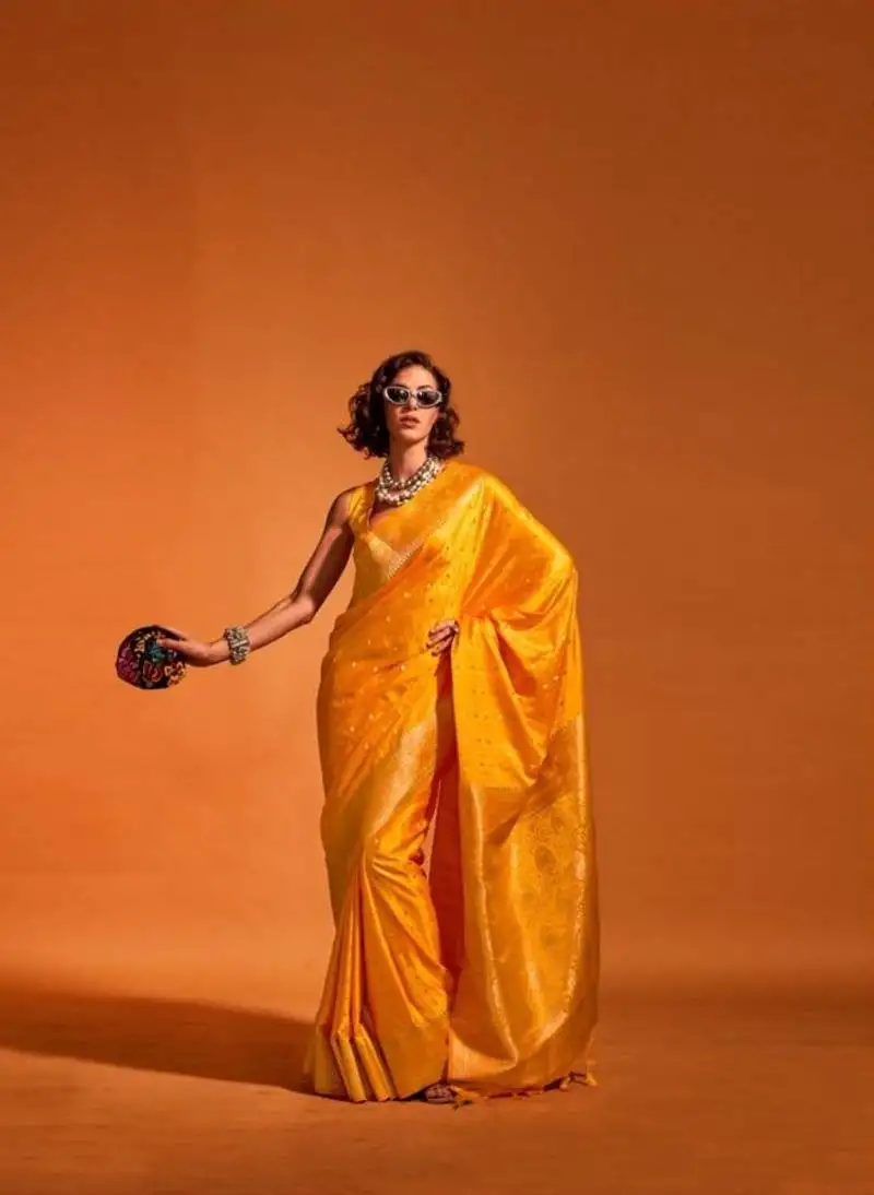 • Yellow satin silk zari weaving rich pallu designer saree with blouse for women