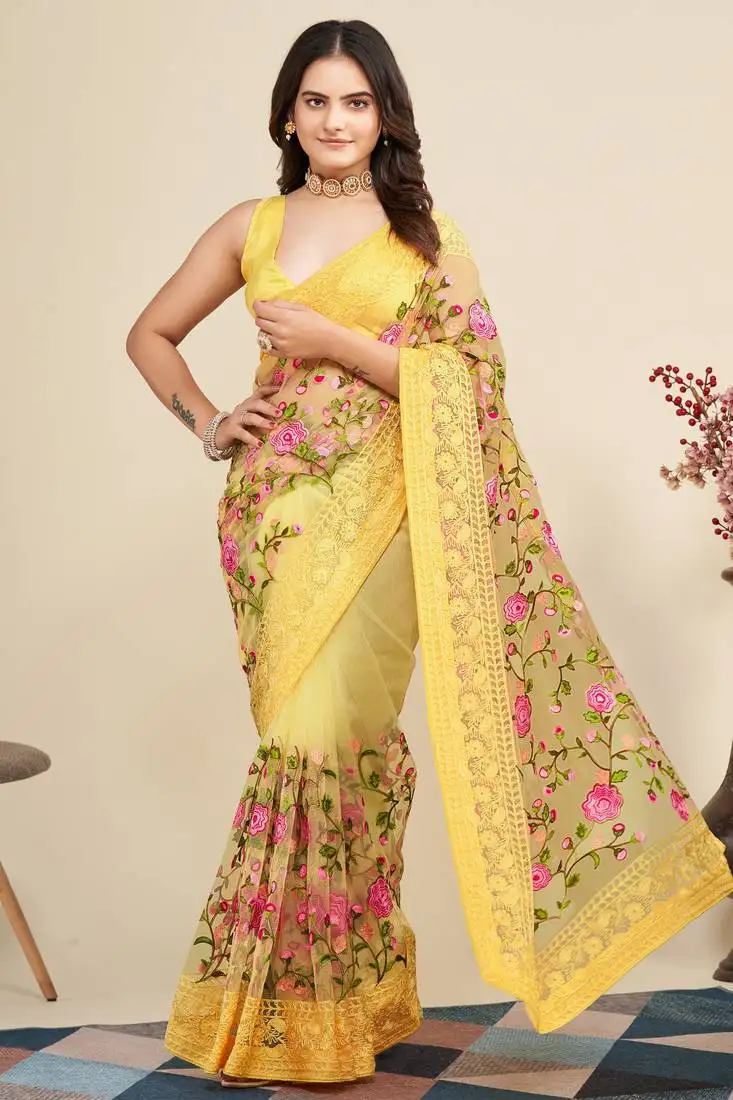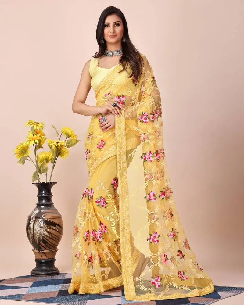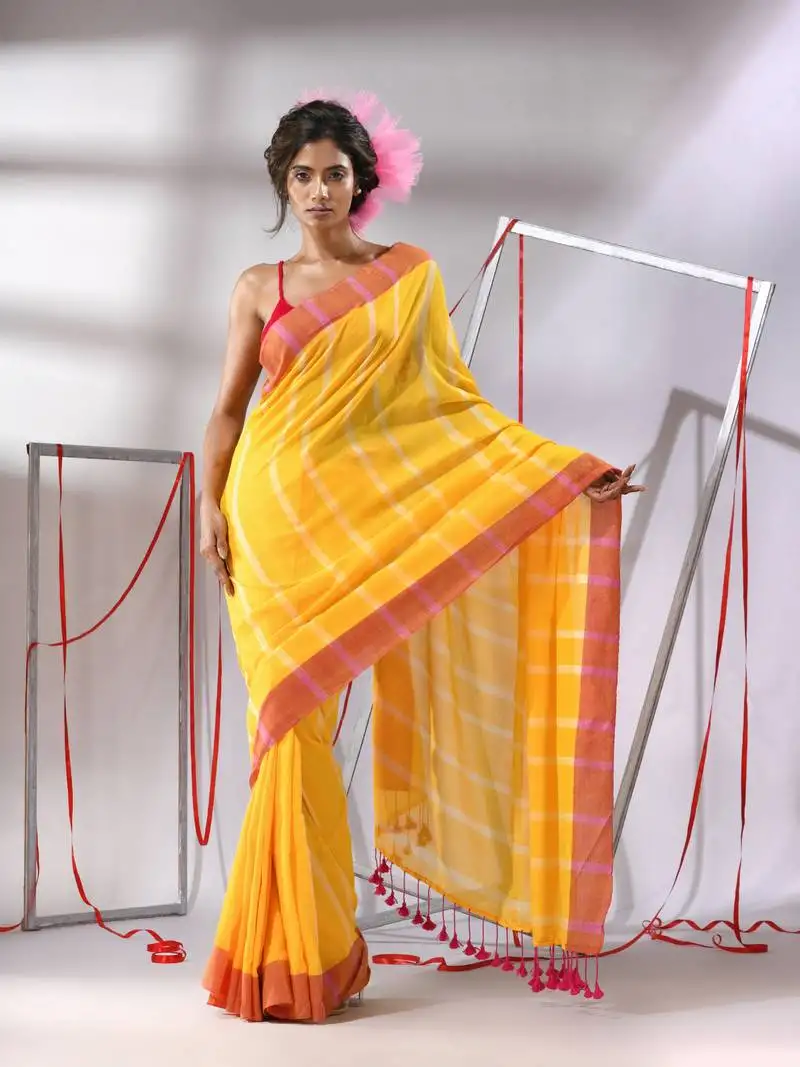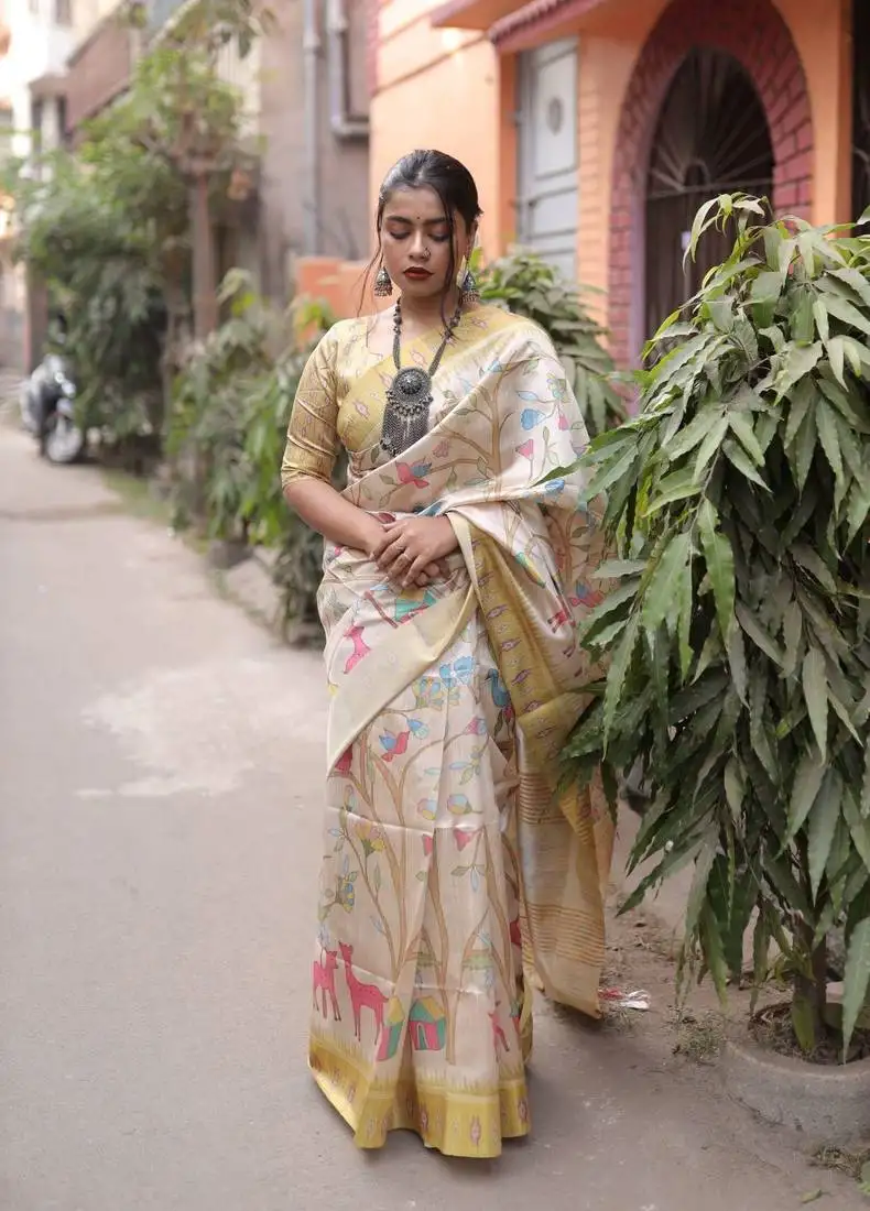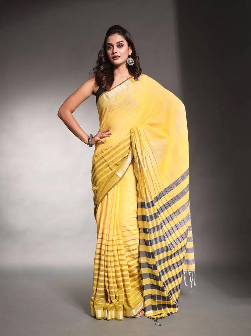 Yellow satin silk zari weaving rich pallu designer saree with blouse for women