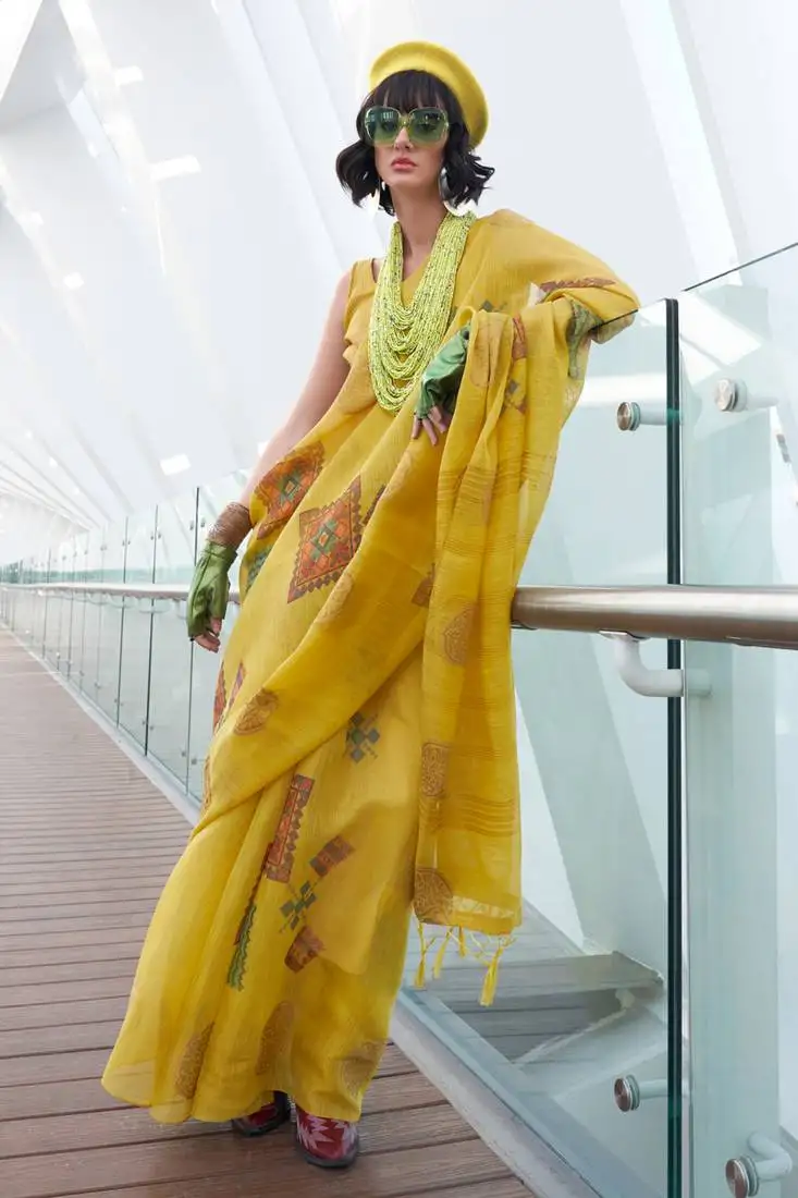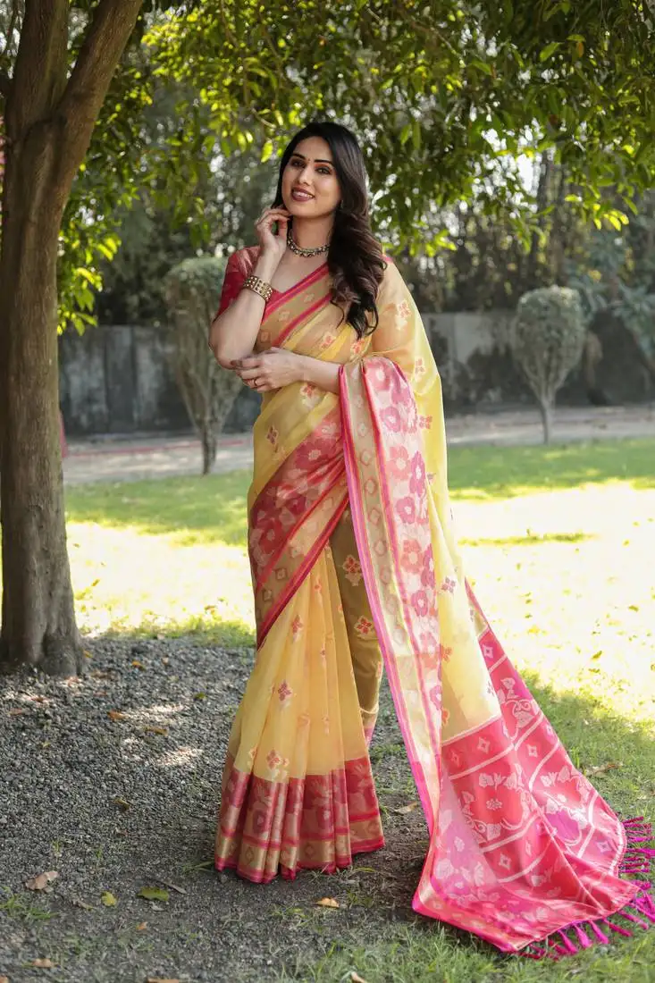 • Yellow woven jacquard designer ethnic partywear traditional saree