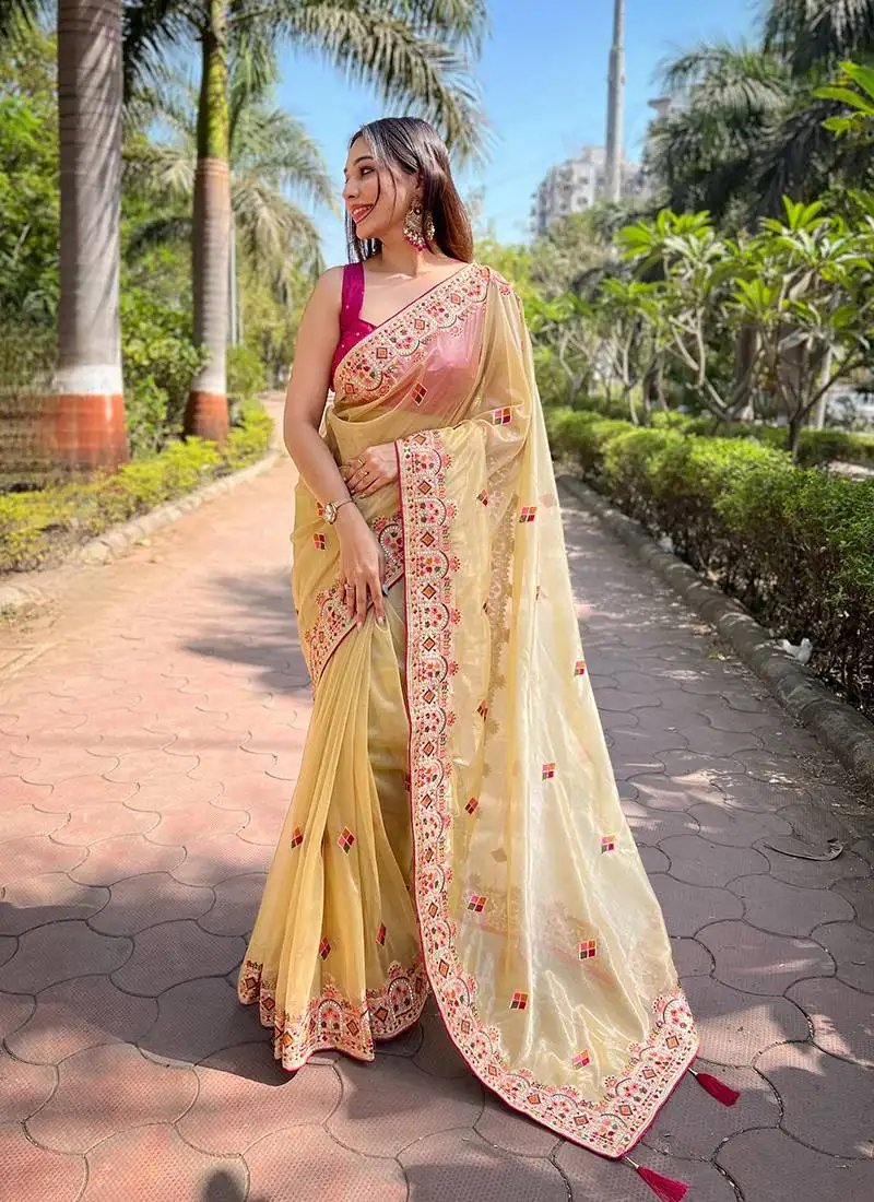 • Yellow twill net designer embroidery work with embellished diamond work saree