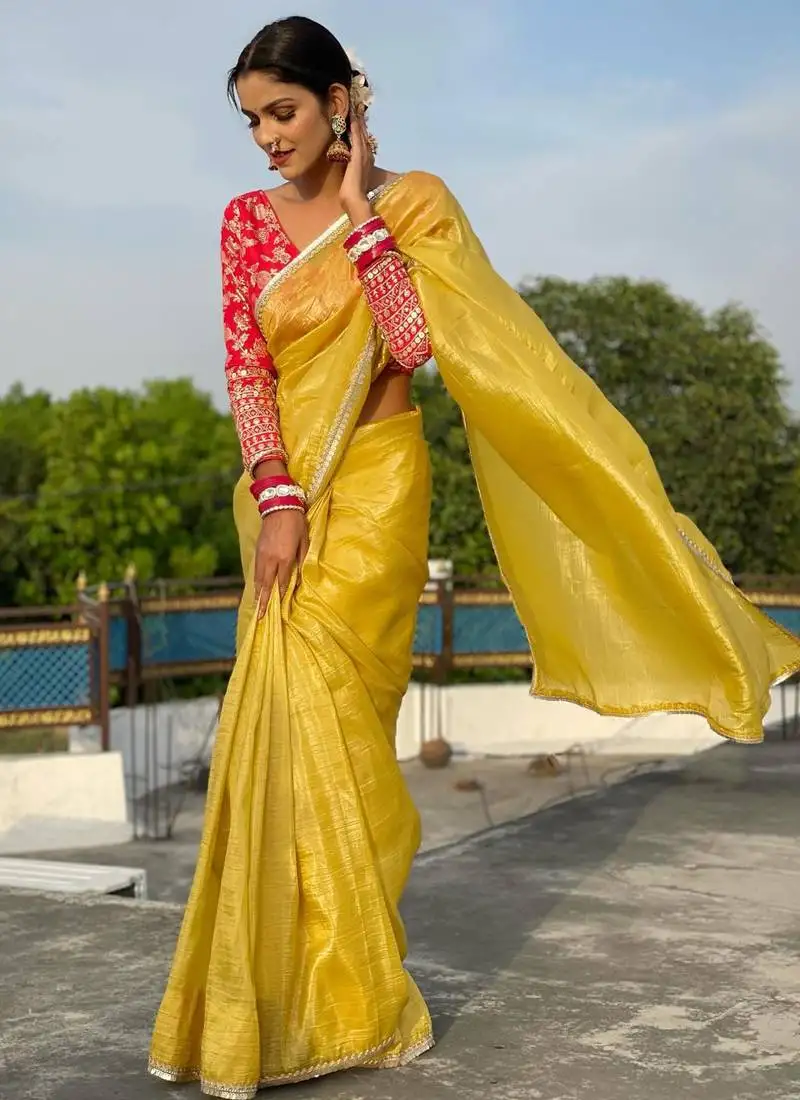 Yellow twill net designer embroidery work with embellished diamond work saree