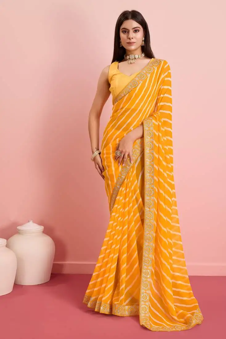 • Yellow woven design leheriya soft silk blend saree with blouse