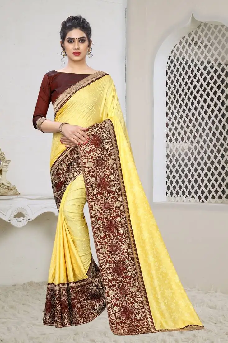 Yellow zari embroidered siroski stone border silk jacquard party wear saree with blouse piece