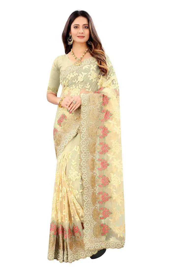 • Yellow zari embroidered moti stone border net saree with attach blouse piece