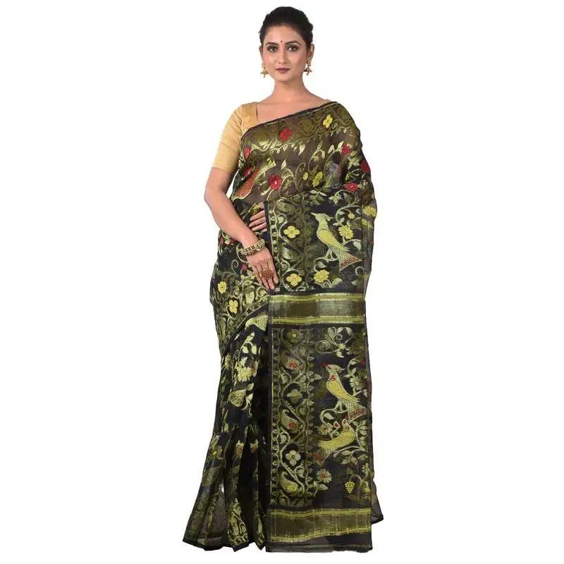 Aishani collection woven cotton silk dhakai jamdani traditional saree (black)