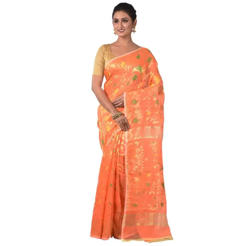 • Aishani collection woven cotton silk dhakai jamdani traditional saree (orange)