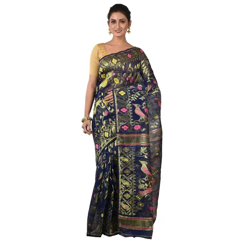 Aishani collection woven cotton silk dhakai jamdani traditional saree (navy blue)