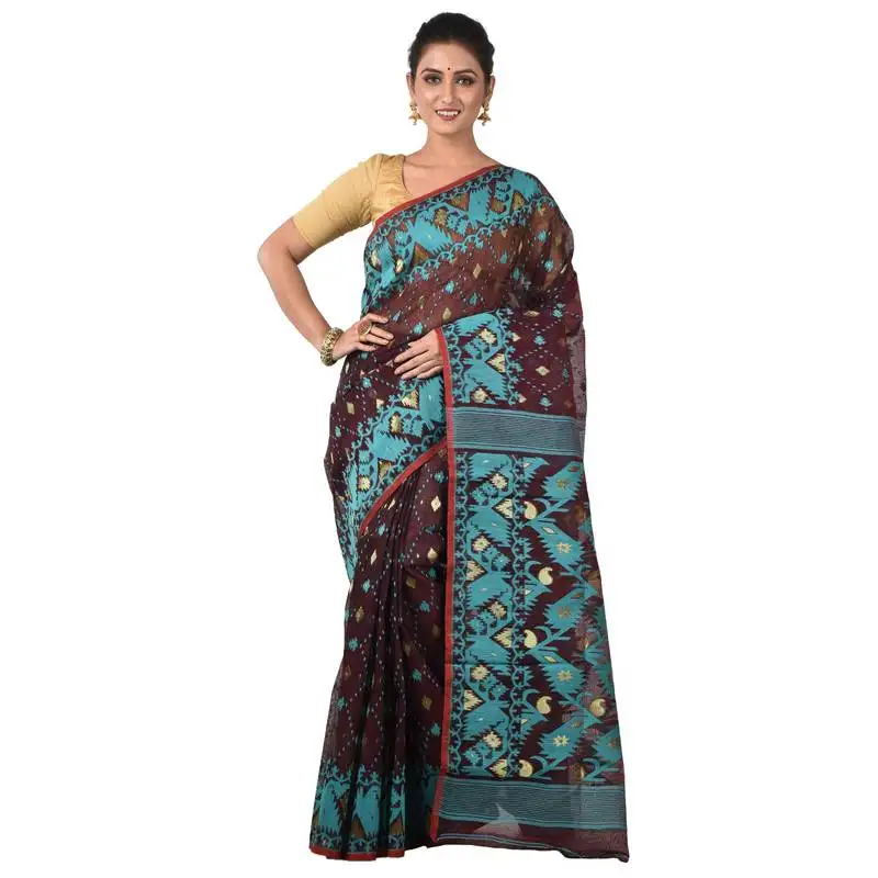 • Aishani collection woven cotton silk dhakai jamdani traditional saree (maroon, blue)