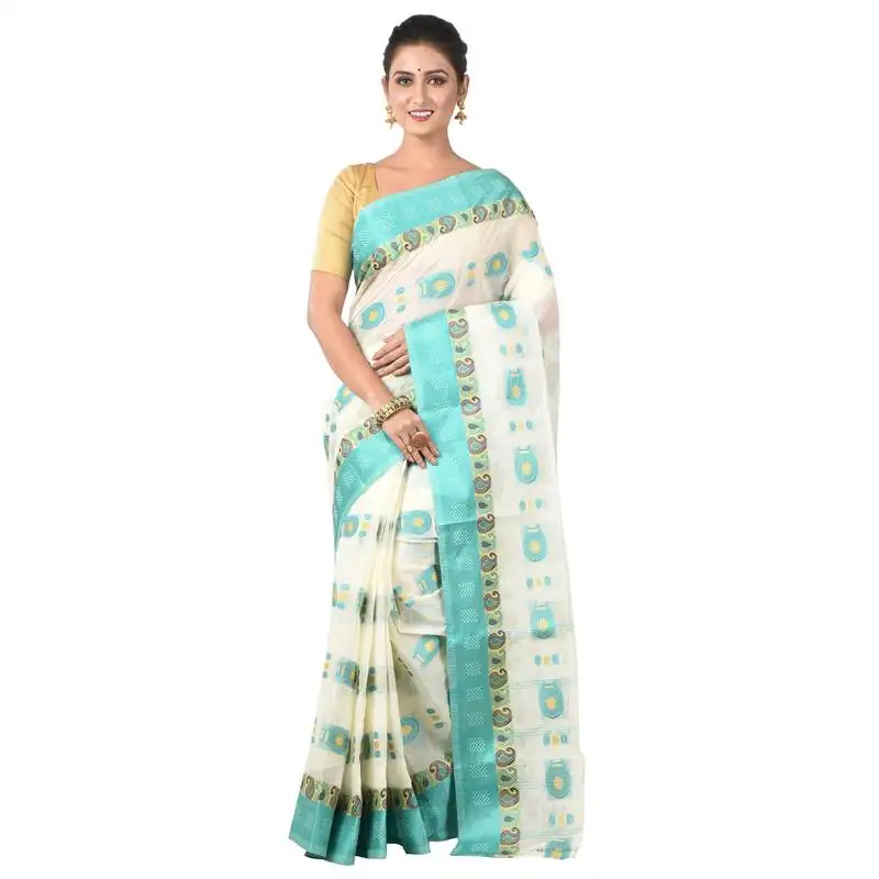 Sale!Aishani collection woven embroidered pure cotton tant handloom saree (white,green)
