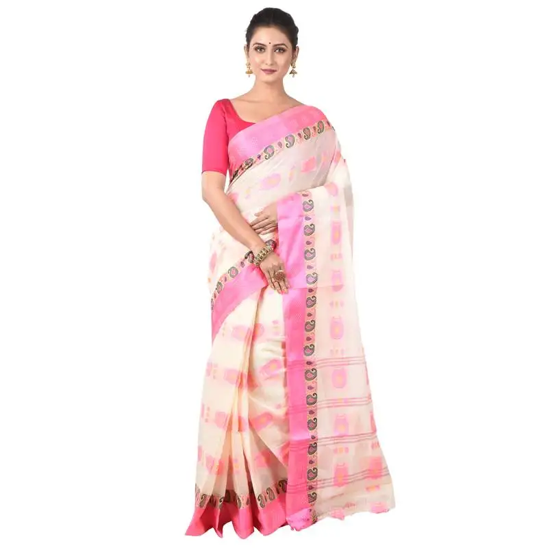 Sale!Aishani collection woven embroidered pure cotton tant handloom saree with bp (pink, white)