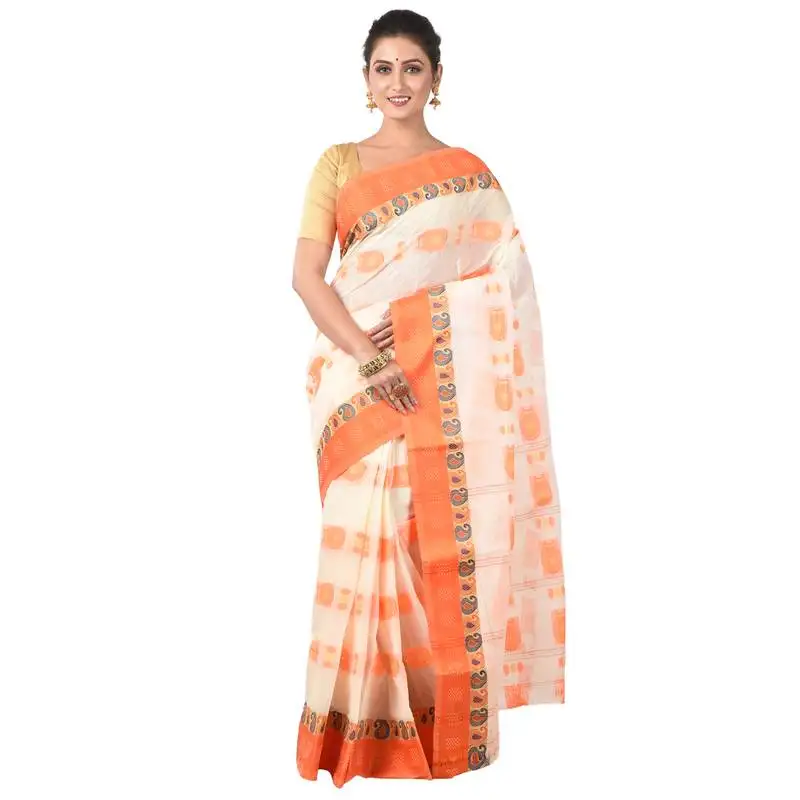 Sale!Aishani collection woven embroidery pure cotton handloom saree (white, orange)