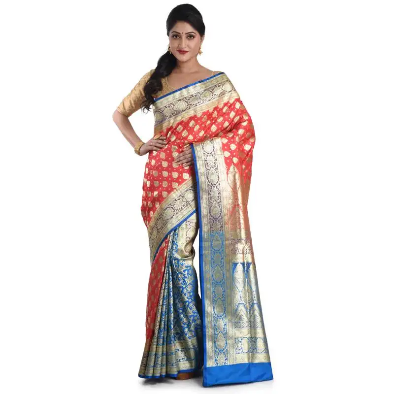 Sale!Aishani collection woven katan silk banarasi wedding saree with bp (peach, blue)