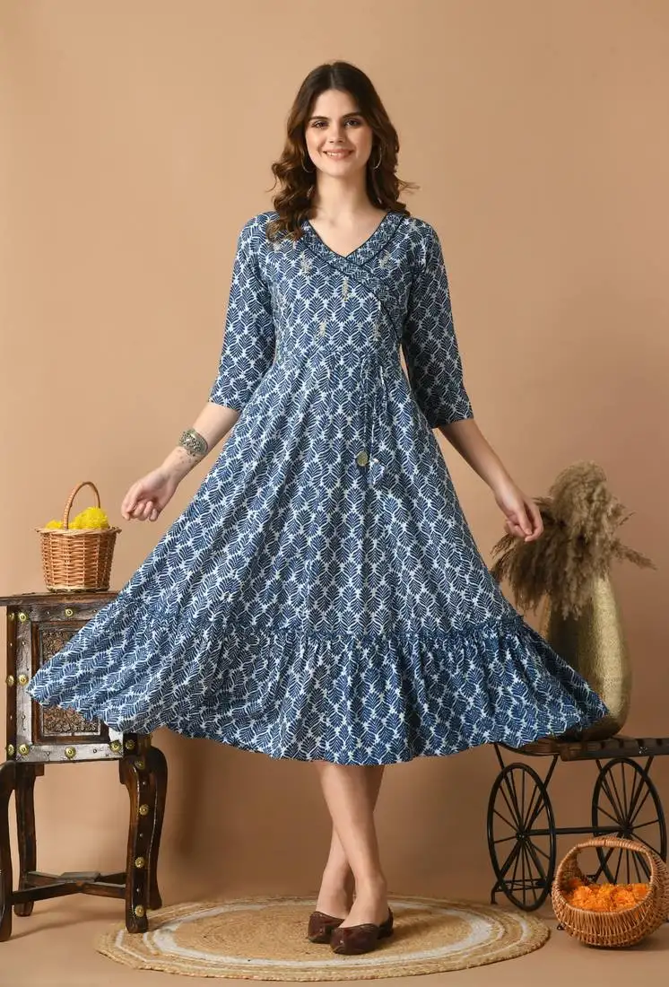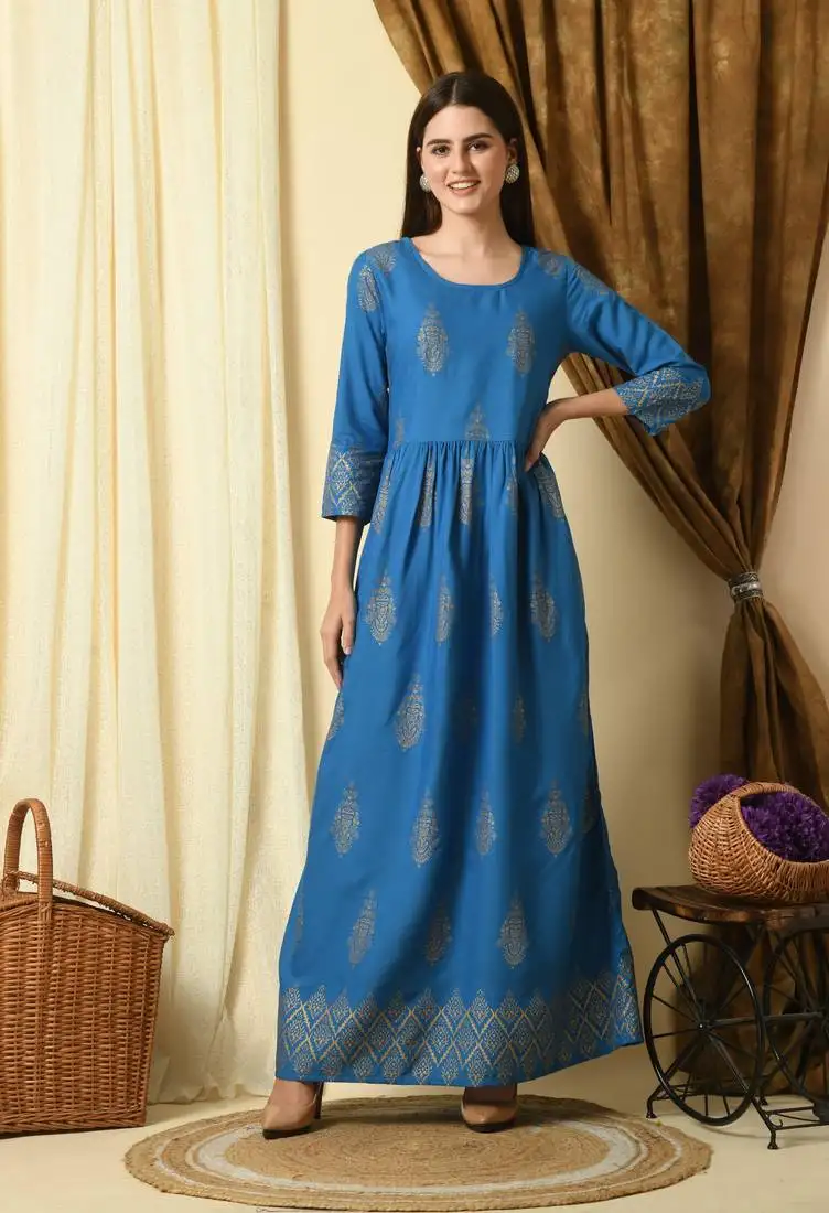 • Blue ethnic motif printed work with embroidred work cotton anarkali kurta