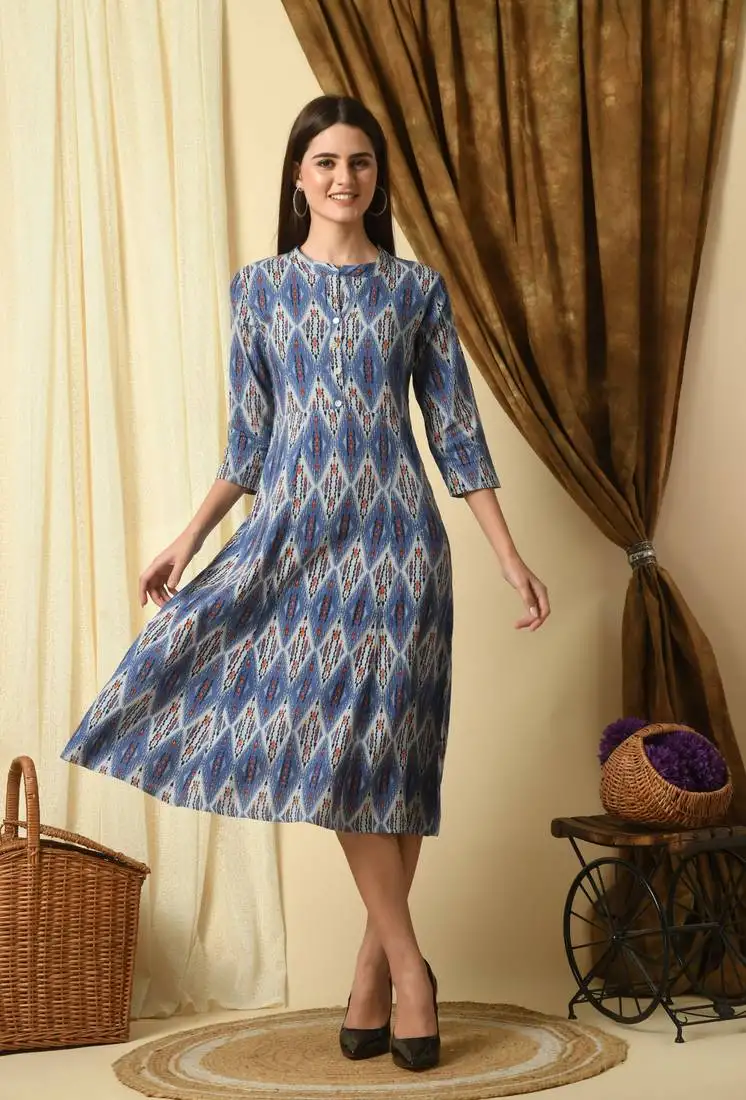 • Blue ethnic motif printed work cotton a-line kurta with pant and dupatta set stitched