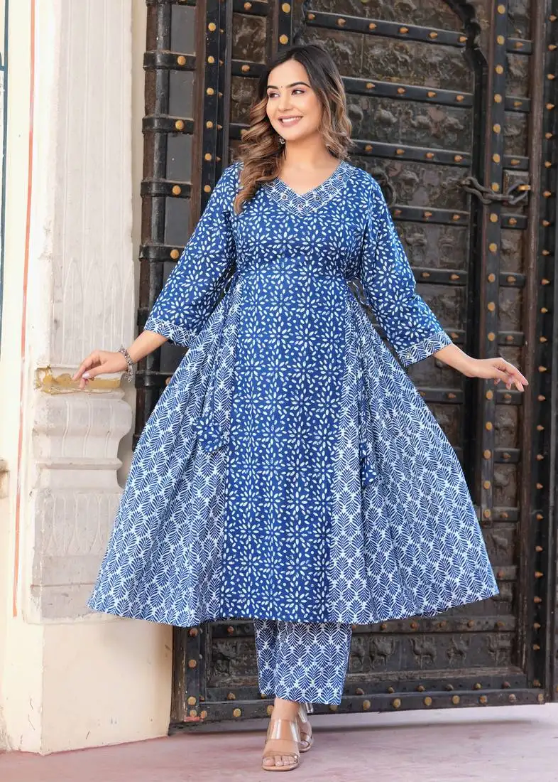 • Blue kantha work cotton a-line kurta with payjama set stitched