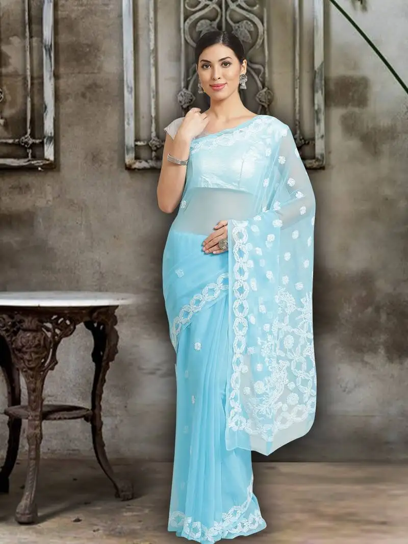 Blue hand embroidered faux georgette women lucknowi chikankari saree with blouse