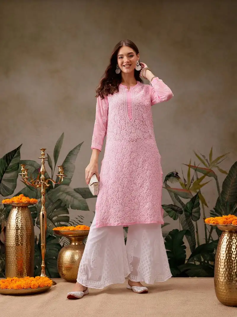 • Hand crafted baby pink georgette lucknowi chikankari indian women kurta