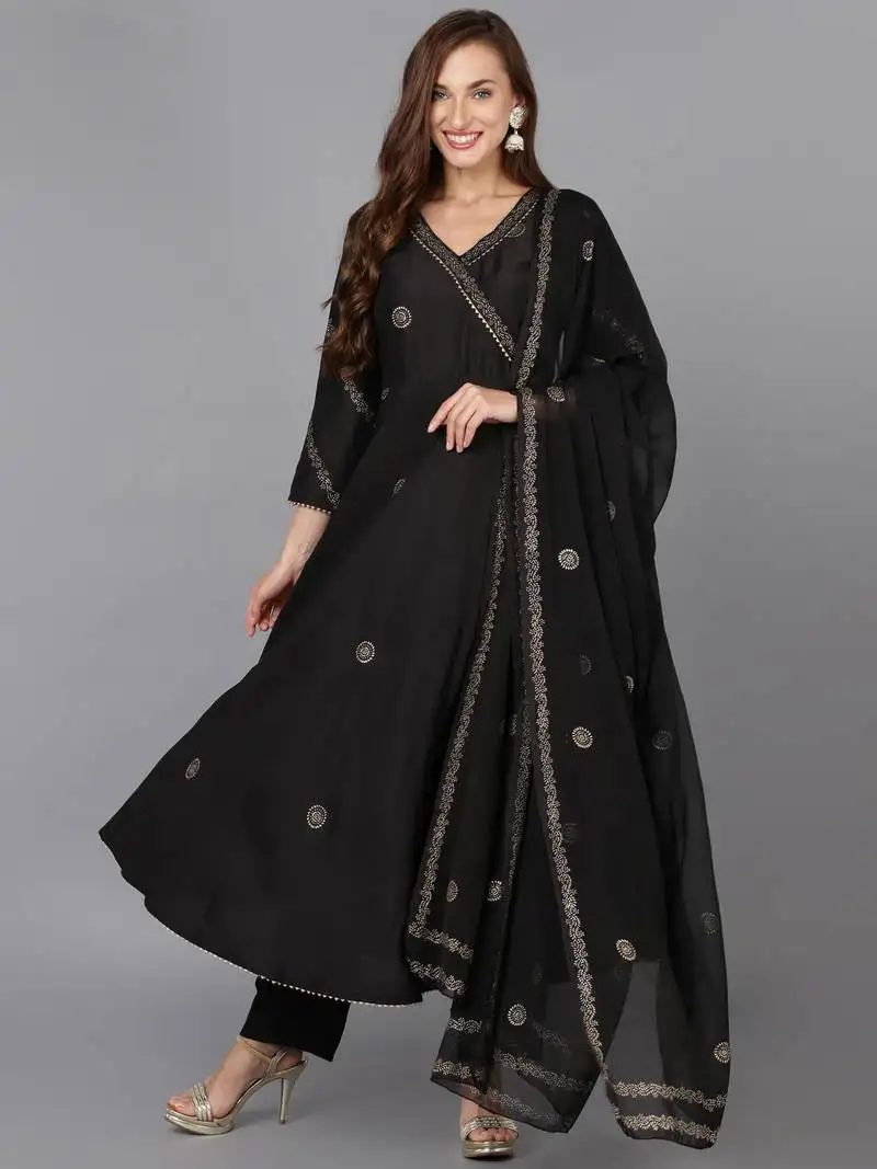Sale!Black color printed silk blend styles kurta trouser with dupatta