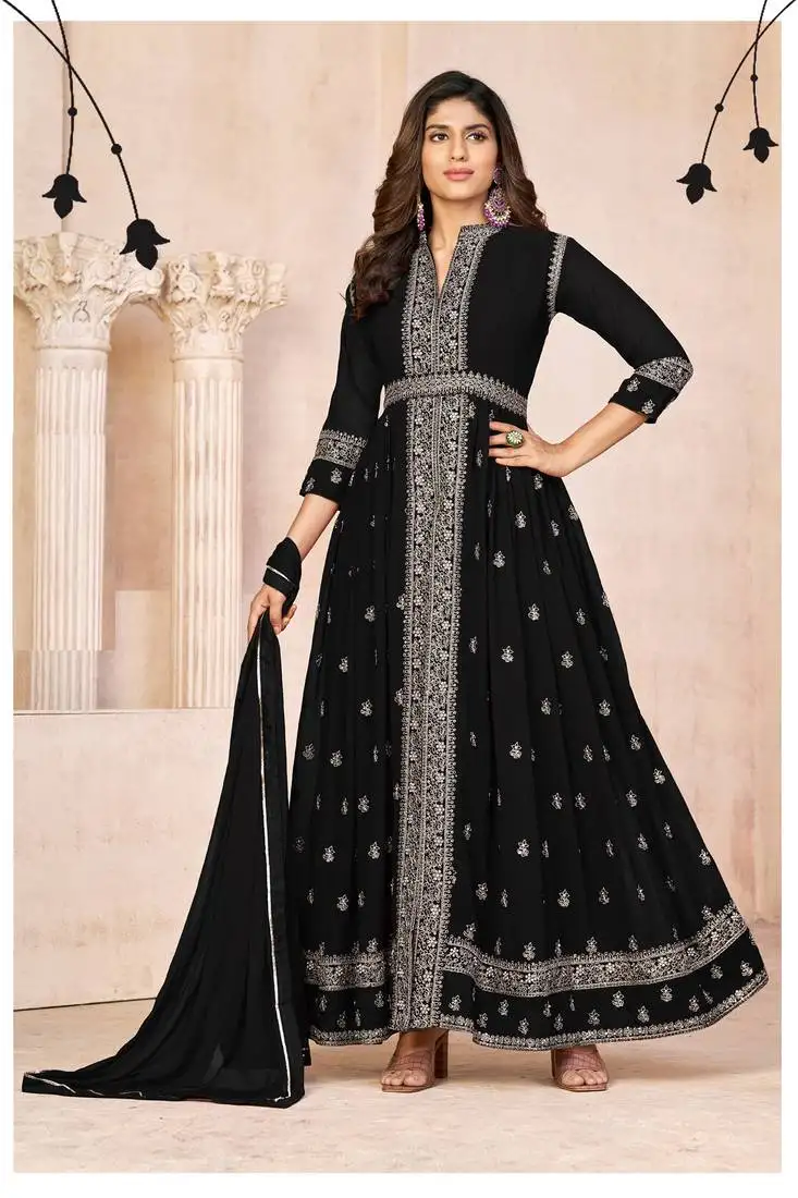 Sale!Black embroidered faux georgette semi stitched anarkali suit