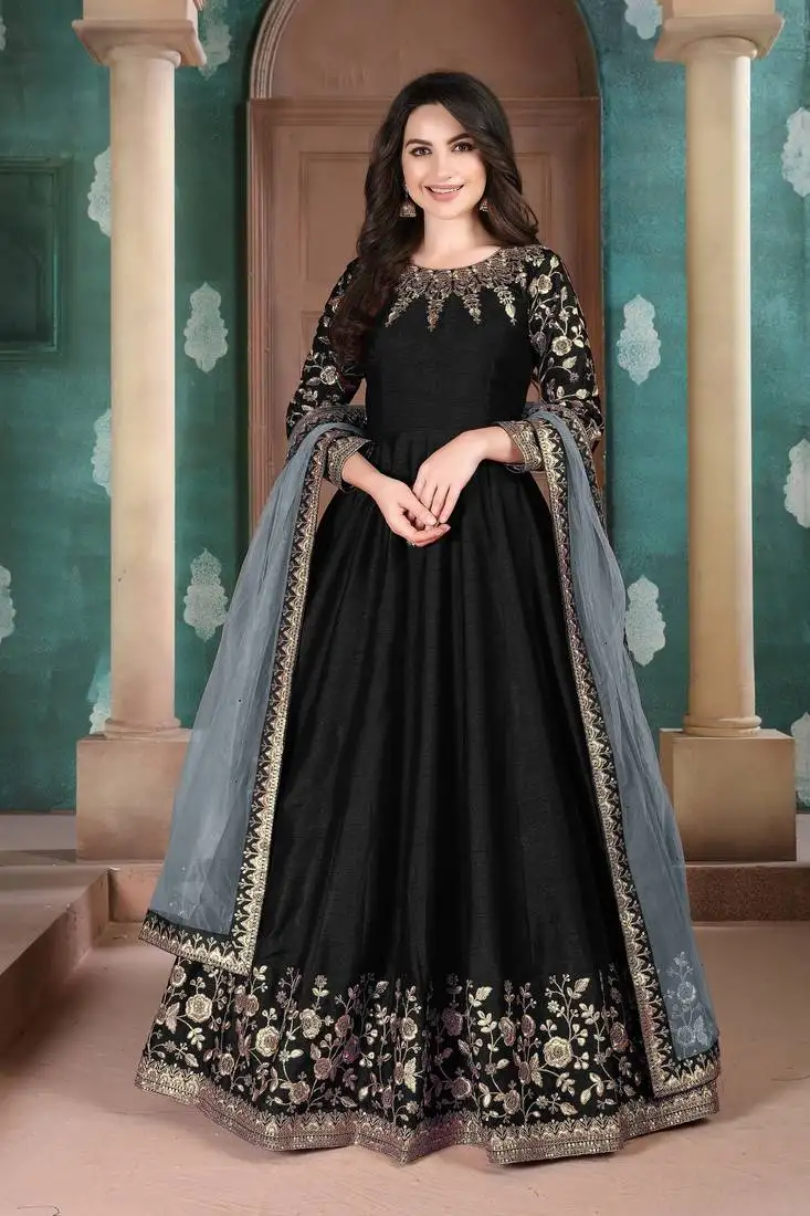 Sale!Black embroidered adda silk semi stitched anarkali suit