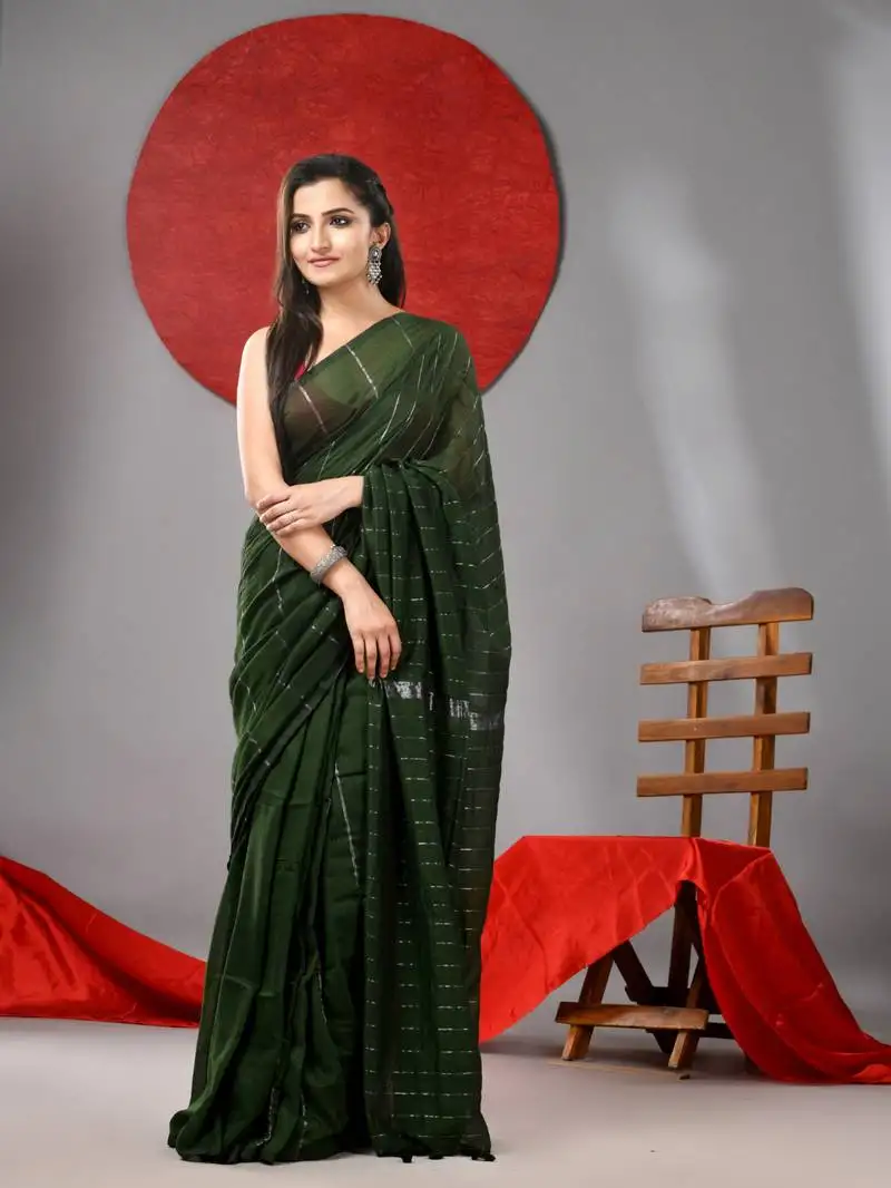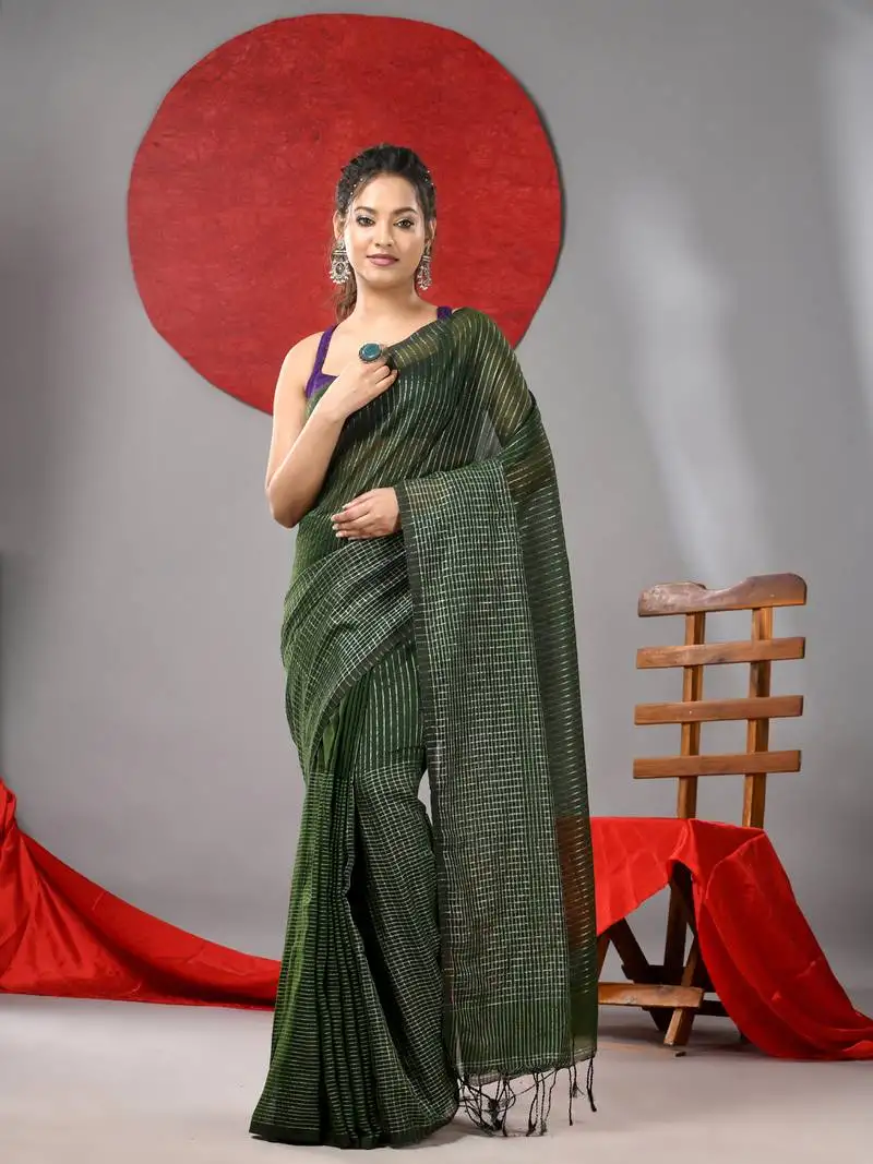 Sale!Green linen soft saree with woven designs