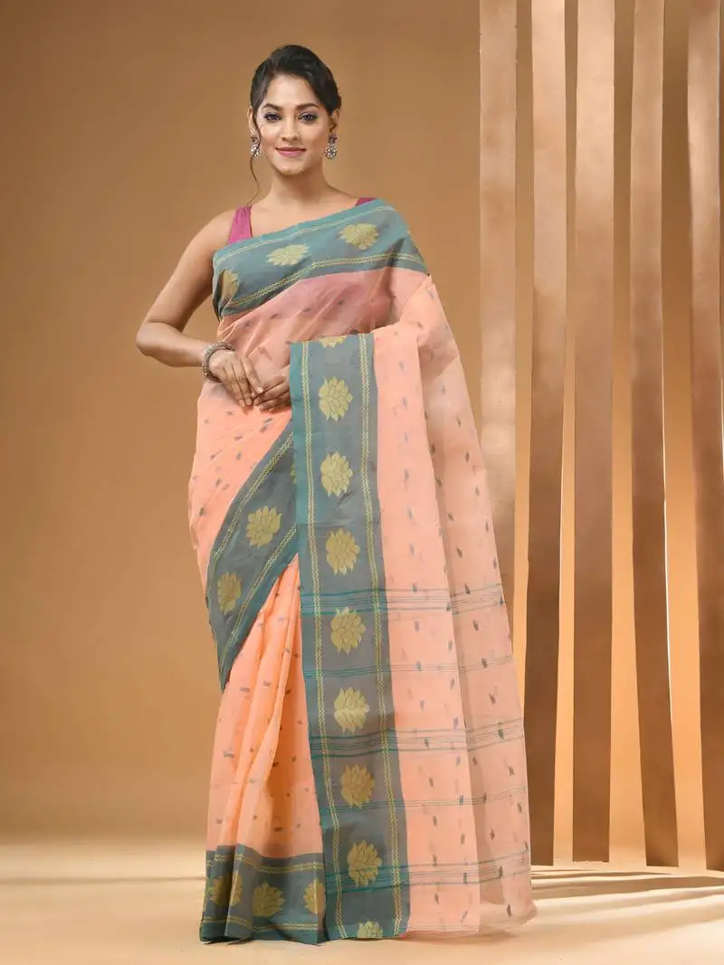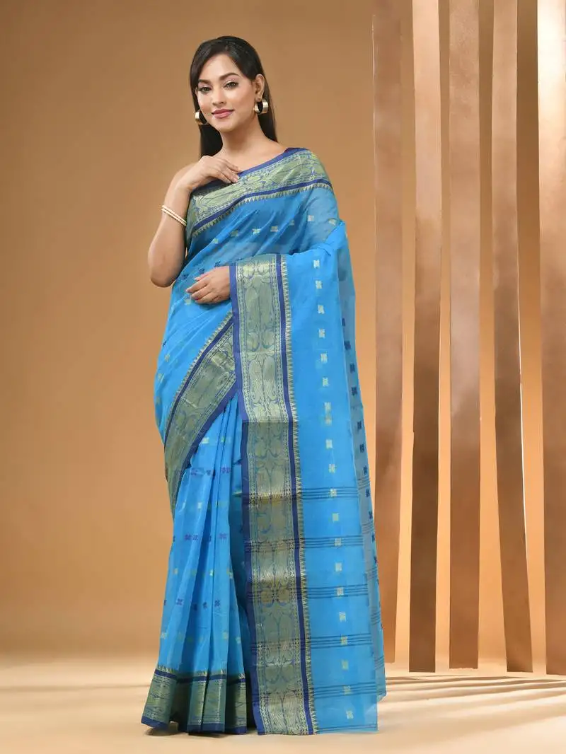 Sapphire blue pure cotton tant saree with woven designs without blouse