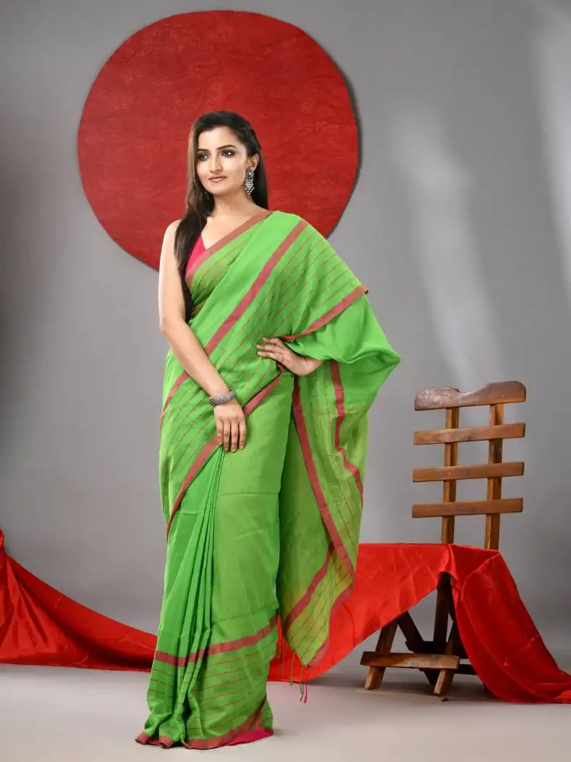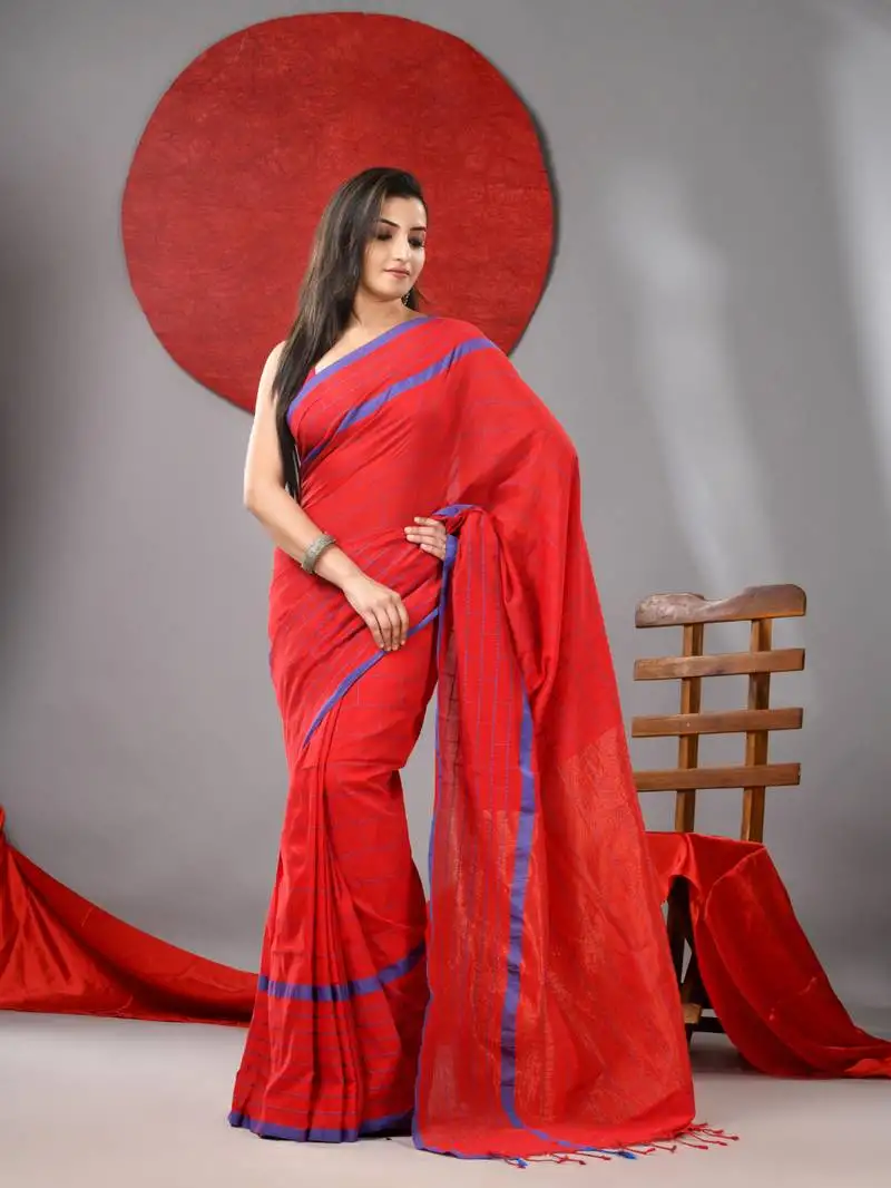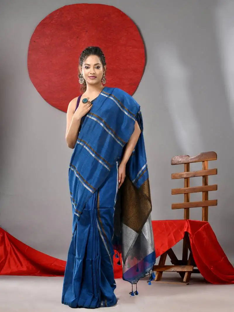• Sapphire blue pure cotton tant saree with woven designs without blouse