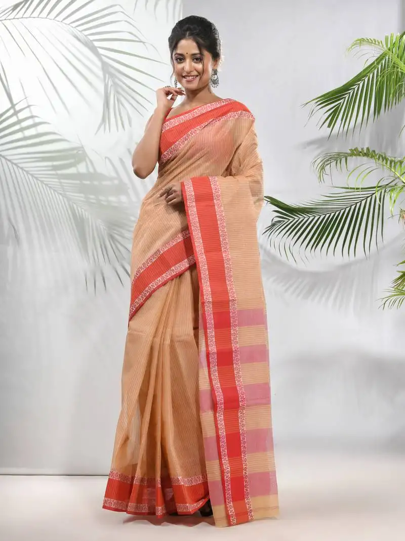 Sale!Beige pure cotton tant saree with woven designs without blouse