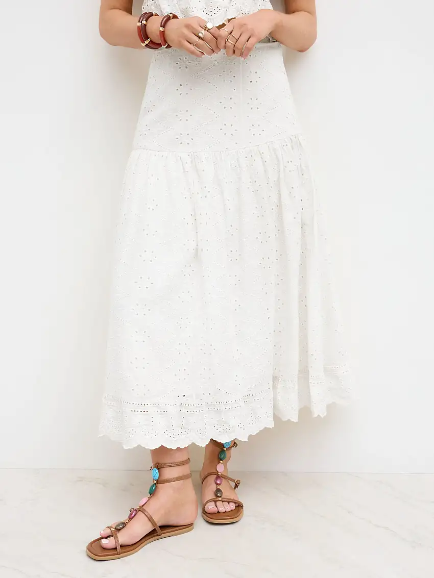 Sale!100% Cotton Mid Rise Broderie Anglaise Ruffle Maxi Skirt