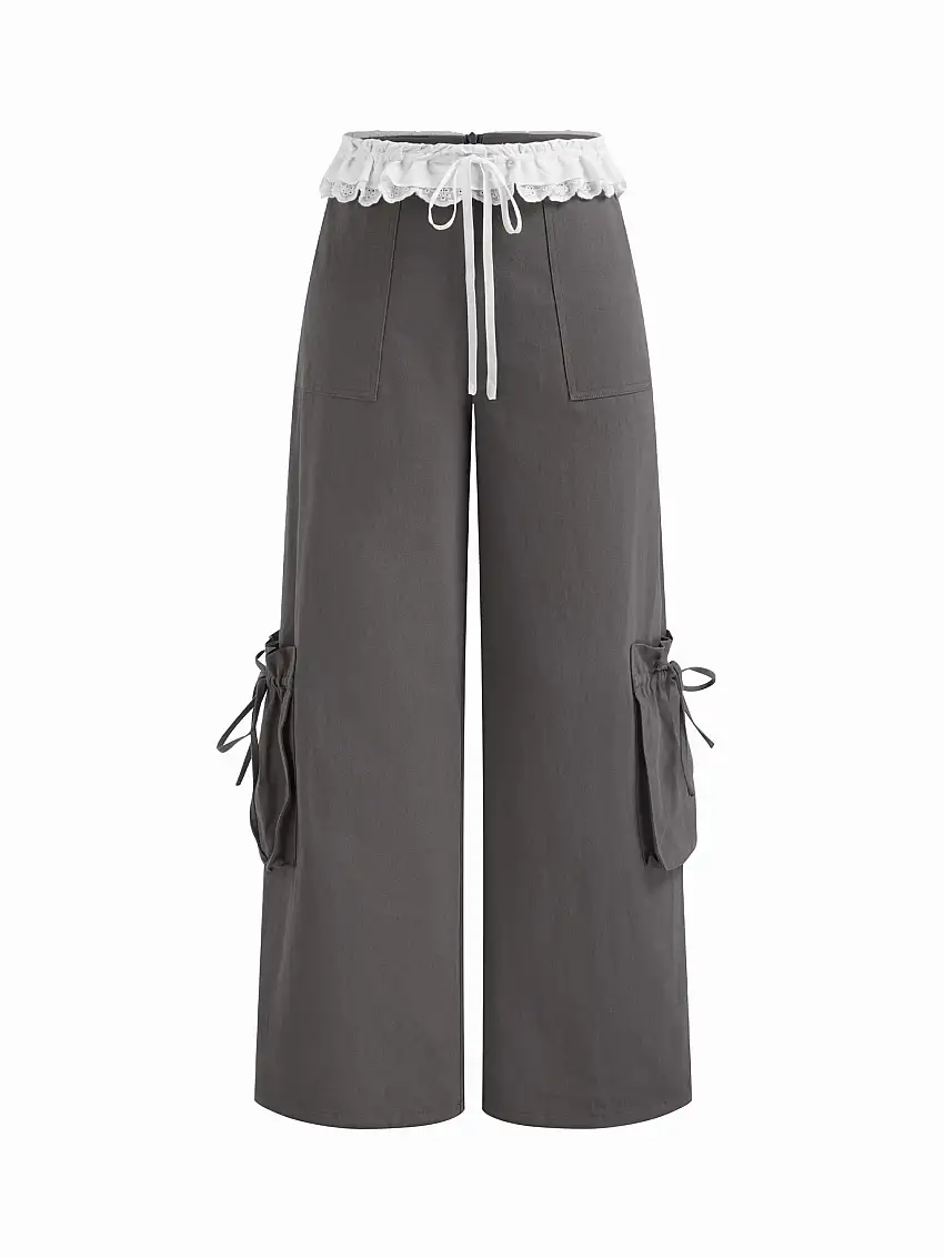 Sale!100% Cotton Mid Rise Contrasting Lace Ruffle Trim Cargo Straight Leg Trousers