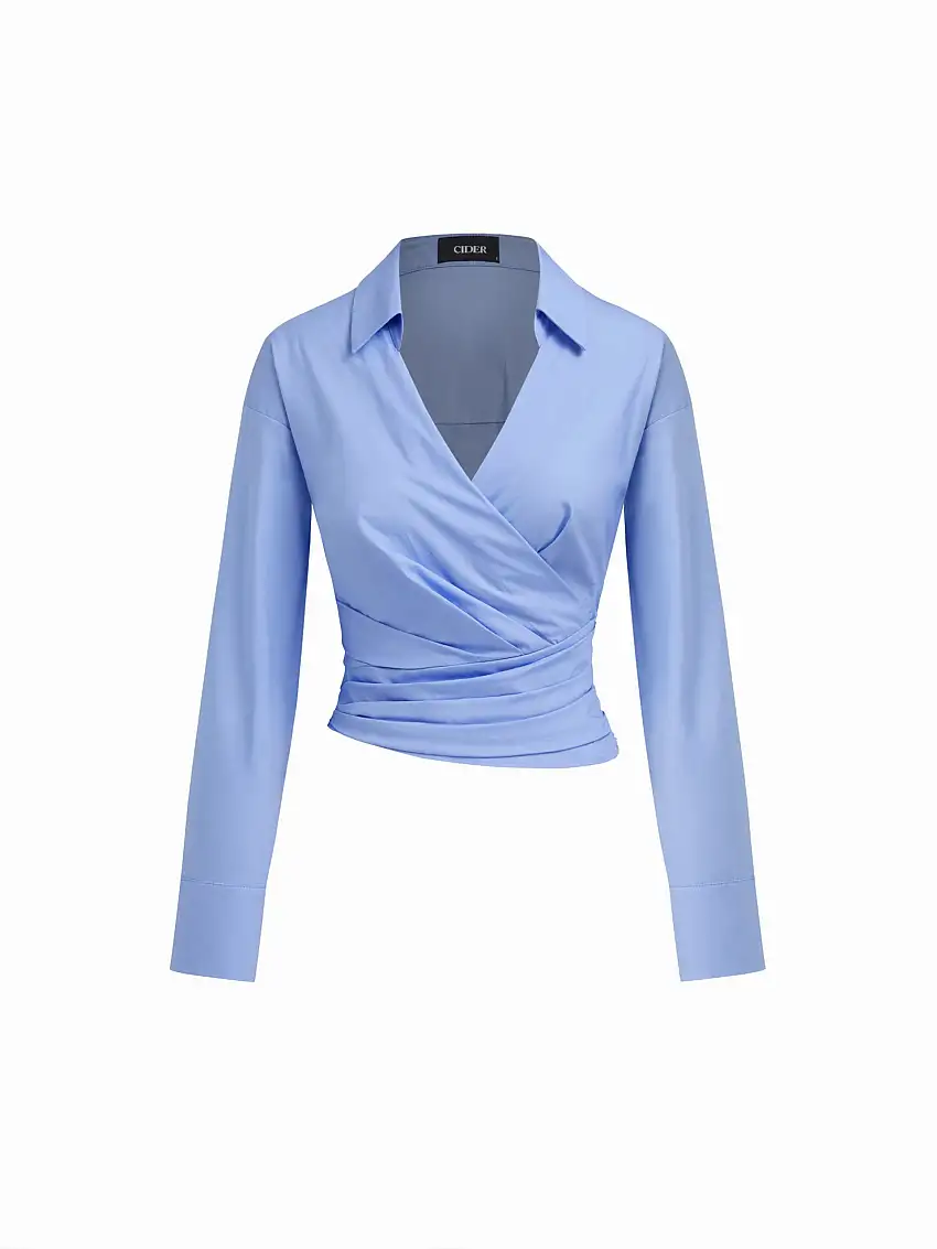 Sale!100% Cotton Collar V-neck Wrap Ruched Cinched Waist Shirt