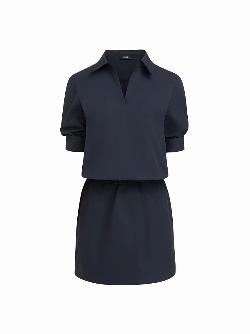 Sale!100% Cotton Collar V-neck Long Sleeve Cinched Waist Mini Dress