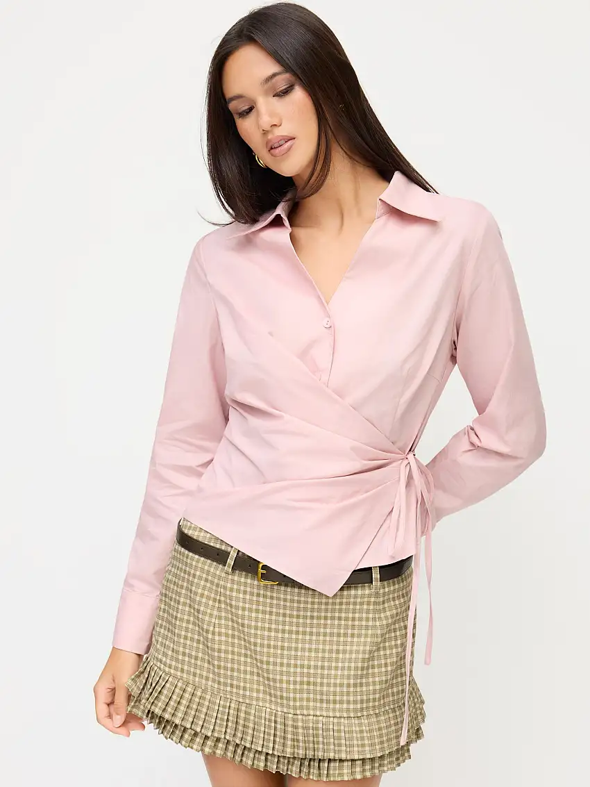Sale!100% Cotton Collar V-neck Long Sleeve Wrap Tie Side Shirt