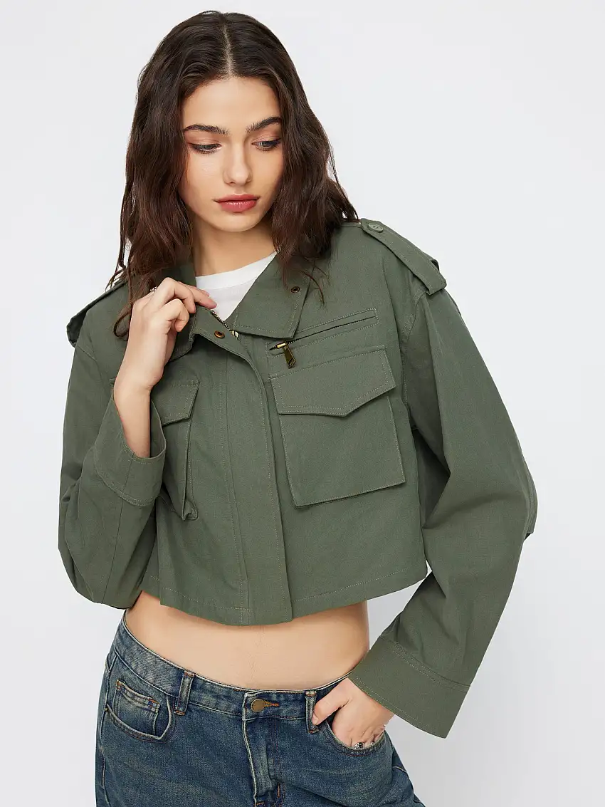 Sale!100% Cotton Collar Zip Through Oversized Crop Jacket